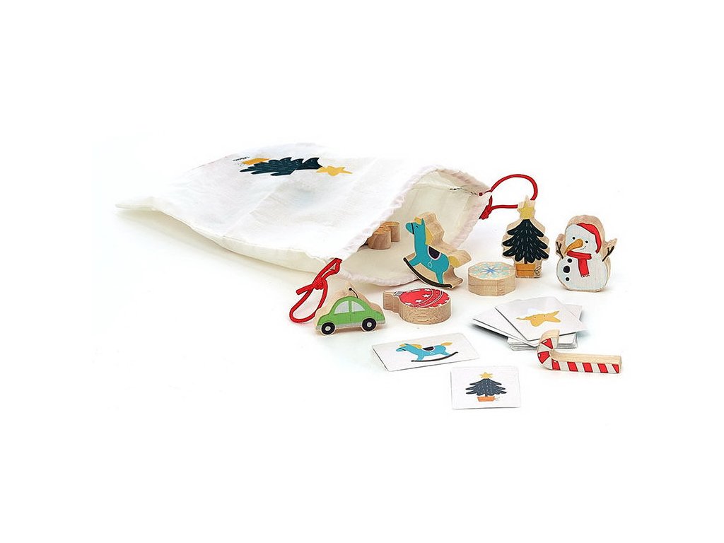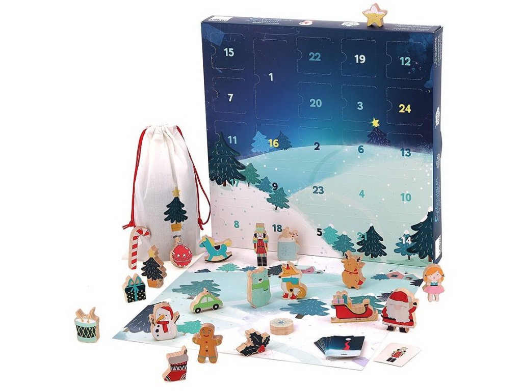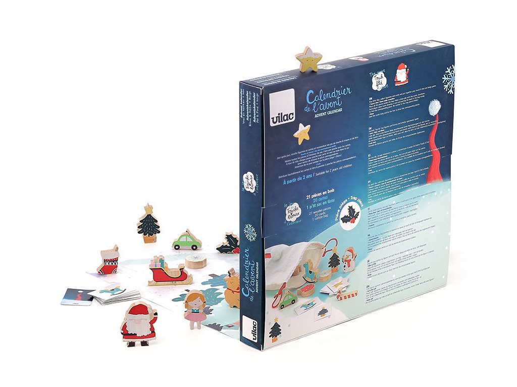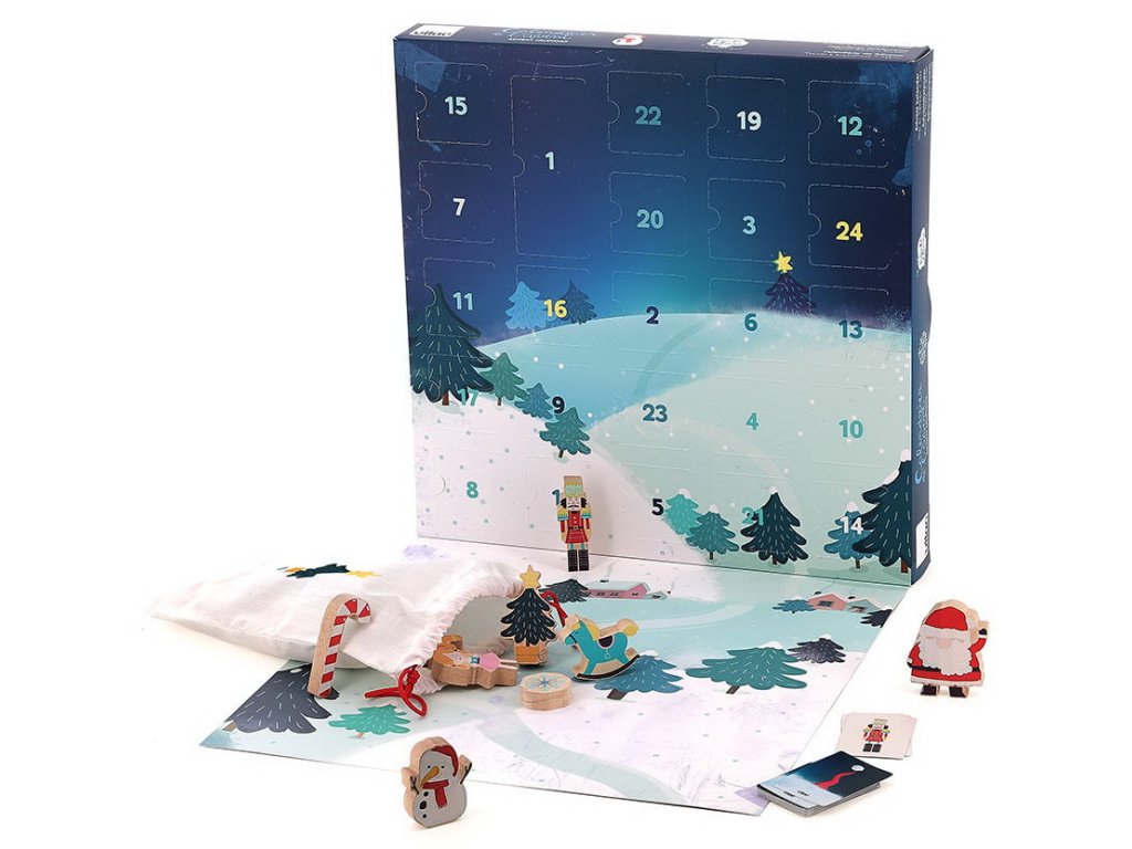 Obsahuje: kalendář s 21 dřevěnými dílky, 20 papírových karet a textilní pytlík