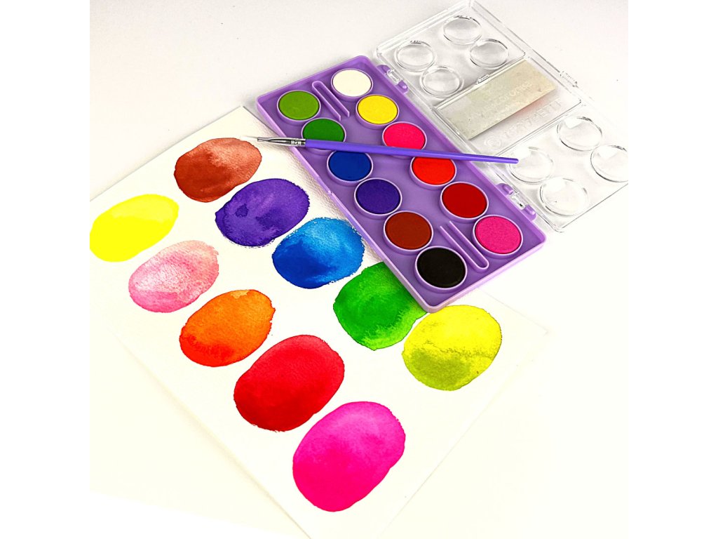 Akvarelové neboli vodové barvy obsahují 12ks zářivých barev. Vytvoříte s nimi krásné obrázky i akvarelové tvoření. Součástí balení je také štětec a paletku ve víčku.