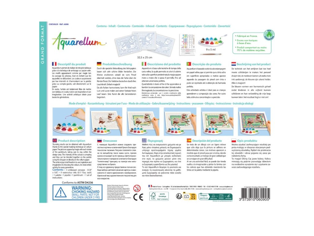 Balení obsahuje: 3 obrázky 25x32,5 cm, 9 akvarelů, 1 vysoce kvalitní štětec, 1 pipeta, 1 paleta pro míchání barev, sadu pokynů