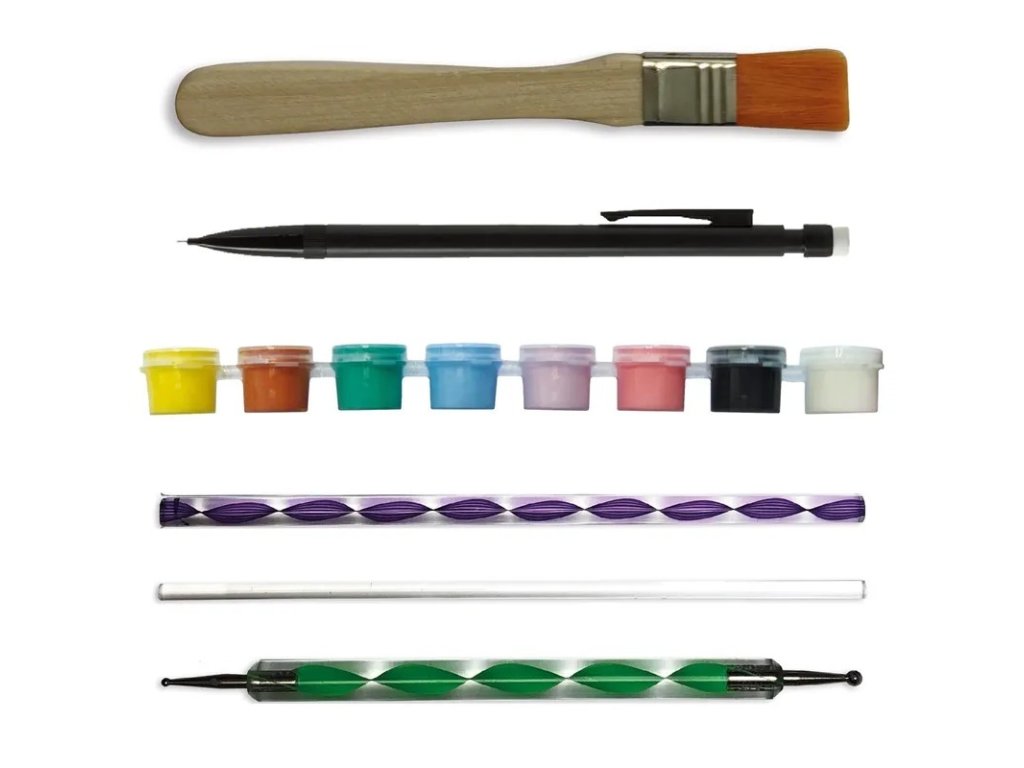 Sada obsahuje 4 dřevěné díly k dotvoření, 1 plastovou šablonu s motivy dle výřezu, 1 mikrotužku, 8 barev na vodní bázi, 1 plochý štětec, 3 tečkovací nástroje - 2 akrylové tyčinky + 1 stylus