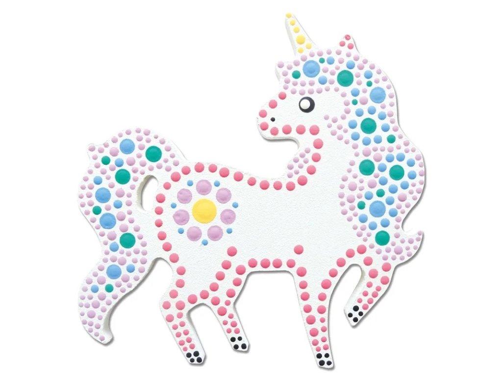 Kreativní sada Tečkování - Jednorožci od firmy Aladine je tvoření pro děti, kde si originálním způsobem a technikou dot painting vyrobí vlastní kouzelné dekorace ze dřeva.