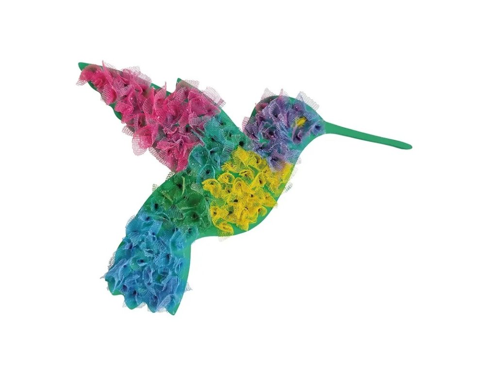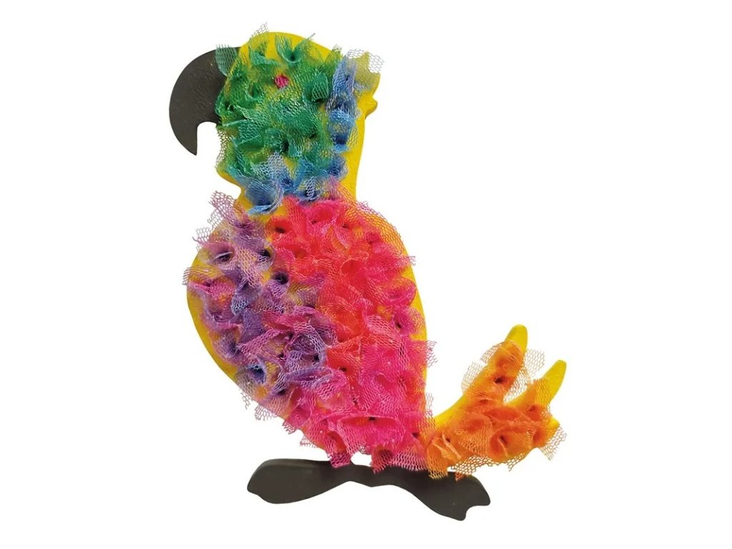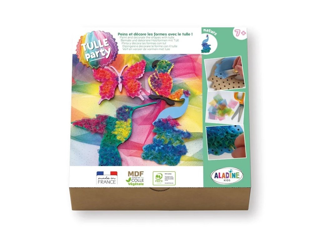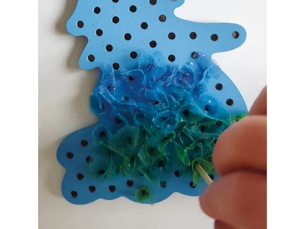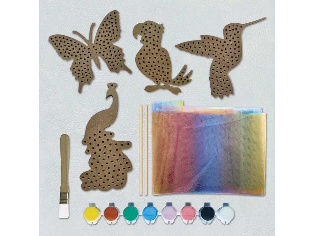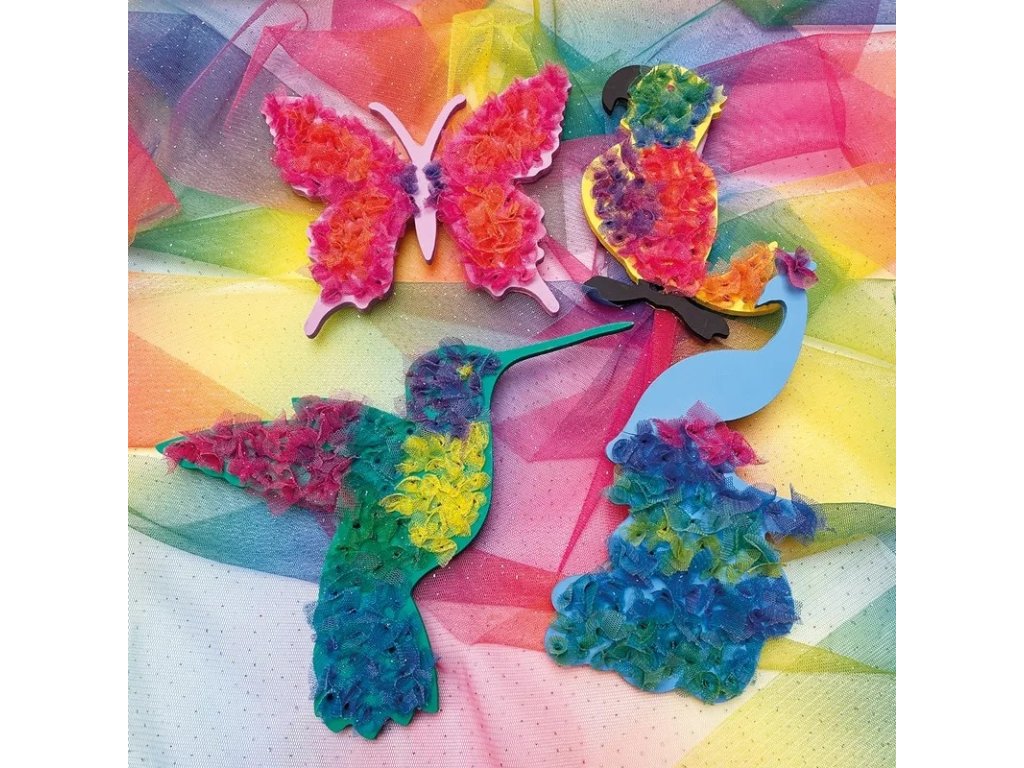 V balení najdou 4 dřevěné výřezy připravené k dotvoření. Ty si musí nejprve nabarvit pomocí přiložených barev. Po zaschnutí barvy si nastříhají kousky tylu o velikosti 2-3 cm a pomocí tyčinky je umisťují na dřevěné dekorace. Těmi si mohou ozdobit třeba svůj pokojíček nebo věnovat jako dárek.