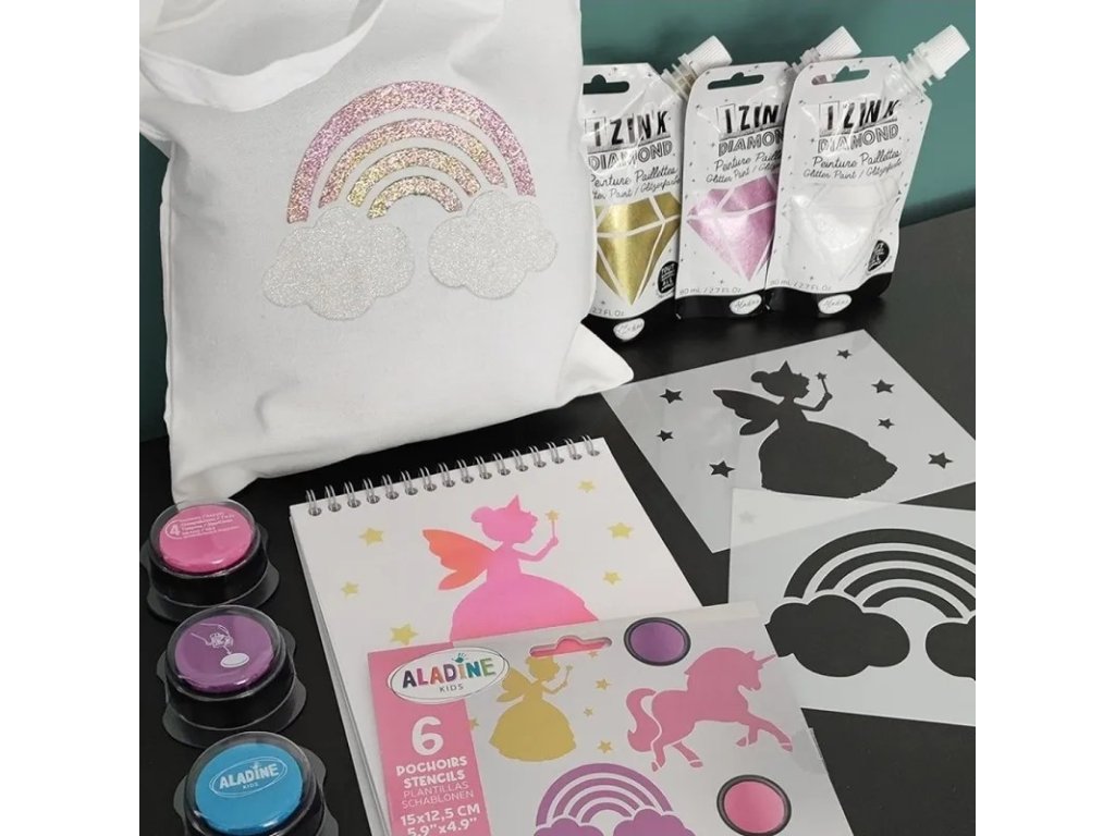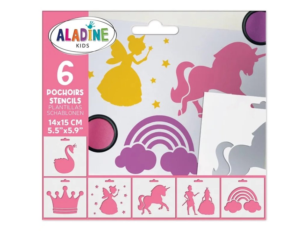 Šablony Princezny od firmy Aladine je sada 6 šablonek pro zábavné malování a vytváření obrázků z pohádek. Děti si vytvoří obrázky princezen i pohádkových postav.