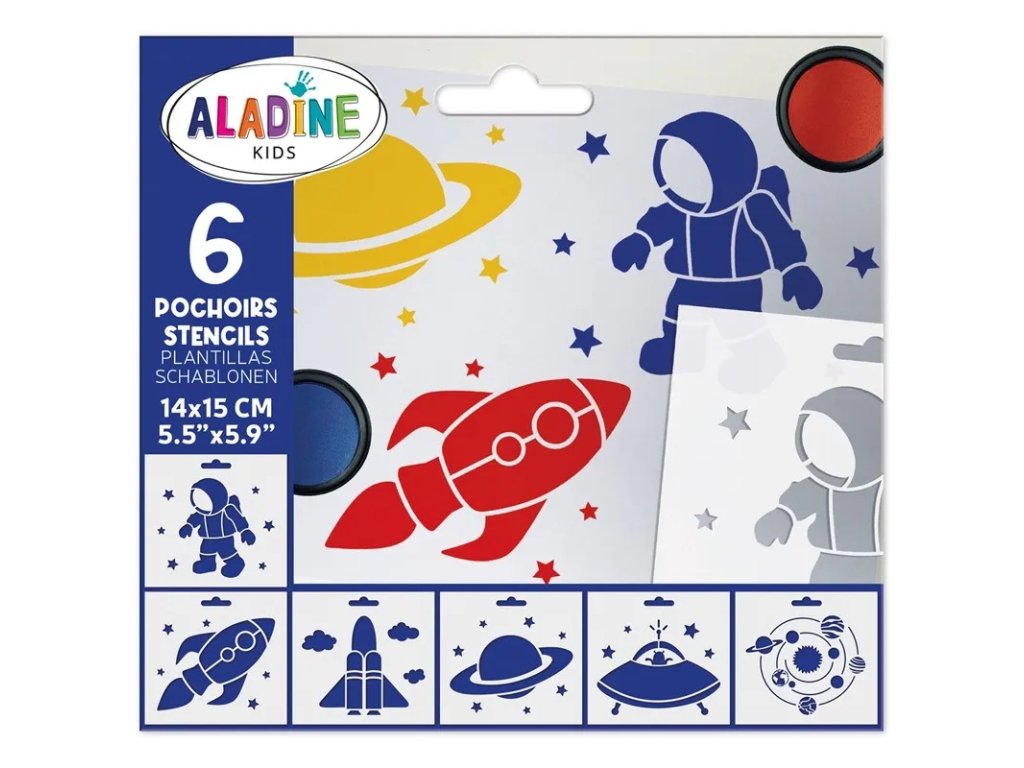 Šablony Vesmír od firmy Aladine je sada 6 šablonek pro zábavné malování a vytváření obrázků z celého vesmíru. Děti si vytvoří obrázky planet, vesmírných raket i kosmonauta.