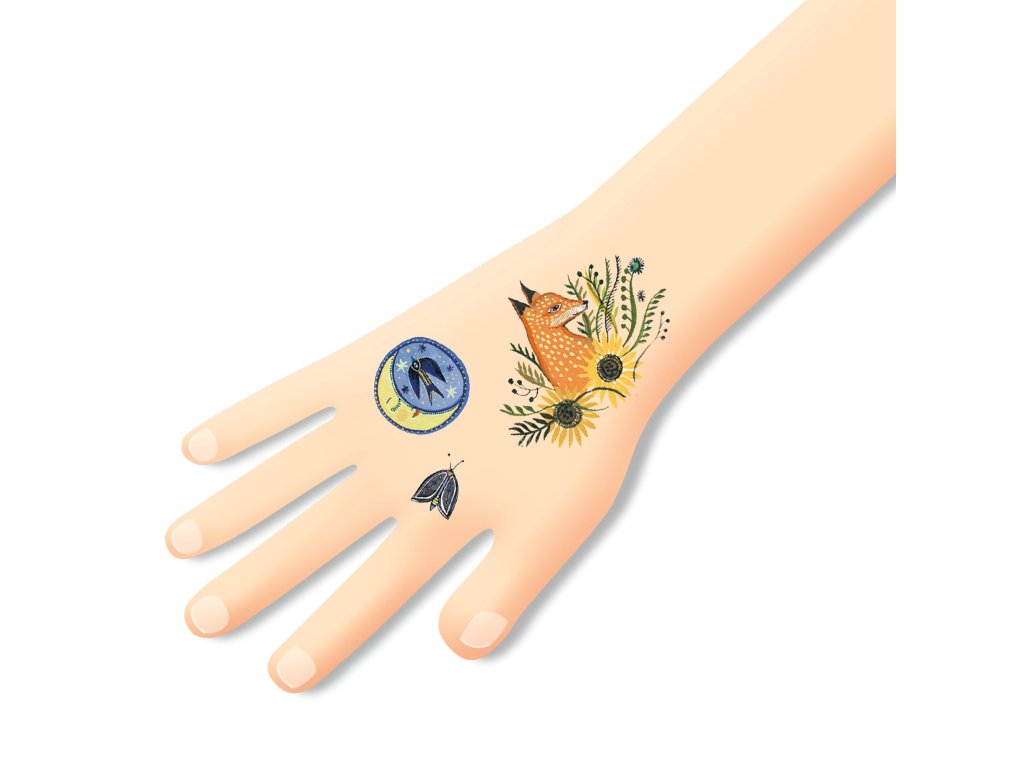 Dětské tetování Noční příroda od firmy Djeco je dokonale malované a kouzelné tetování, které udělá radost všem dětem. A co víc? Toto tetování svítí v noci!