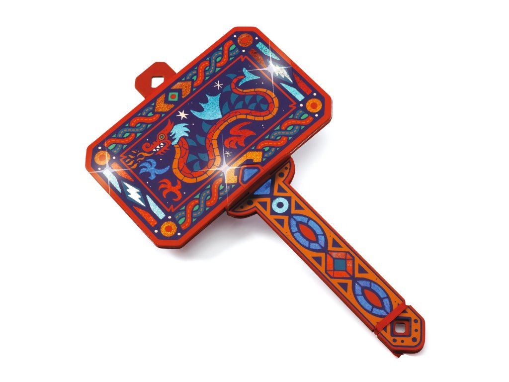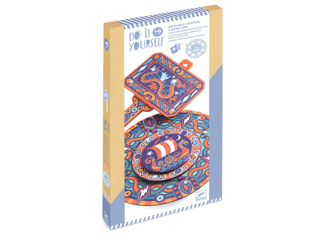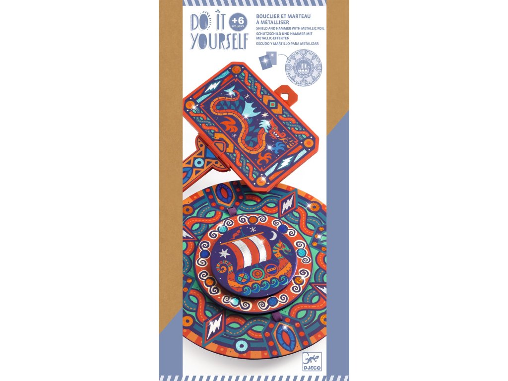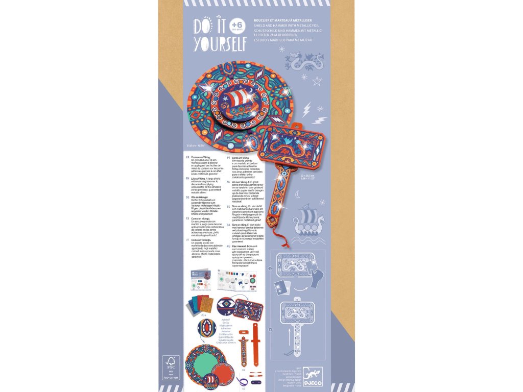 DIY Výtvarná sada Viking od firmy Djeco je kreativní sada, se kterou si děti vytvoří vikingské kladivo a štít s kovovými odlesky. Stačí jen ozdobit jednotlivé komponenty metalickou folií a pak je sestavit dohromady. A hra může začít.