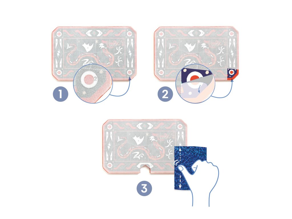 Nepotřebujete žádné lepidlo. Děti sloupnou samolepící dílky a přiloží na ně metalickou fólii. Ta se na místo obtiskne a jako zázrakem vytvoří metalické a kovové odlesky. Vikingská výzbroj tak získají lesk a vypadá jako opravdová.