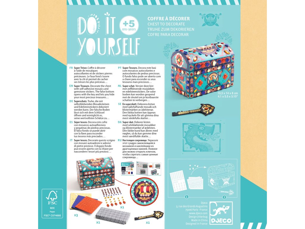 V balení děti najdou pevnou kartonovou truhlu na poklad, kterou si ozdobí pomocí malých lesklých mozaikových dílků a kamínků. Do truhly si mohou uschovat své poklady. Truhla má také speciální tajné dno, které děti otevřou pomocí přiloženého tajného klíče.