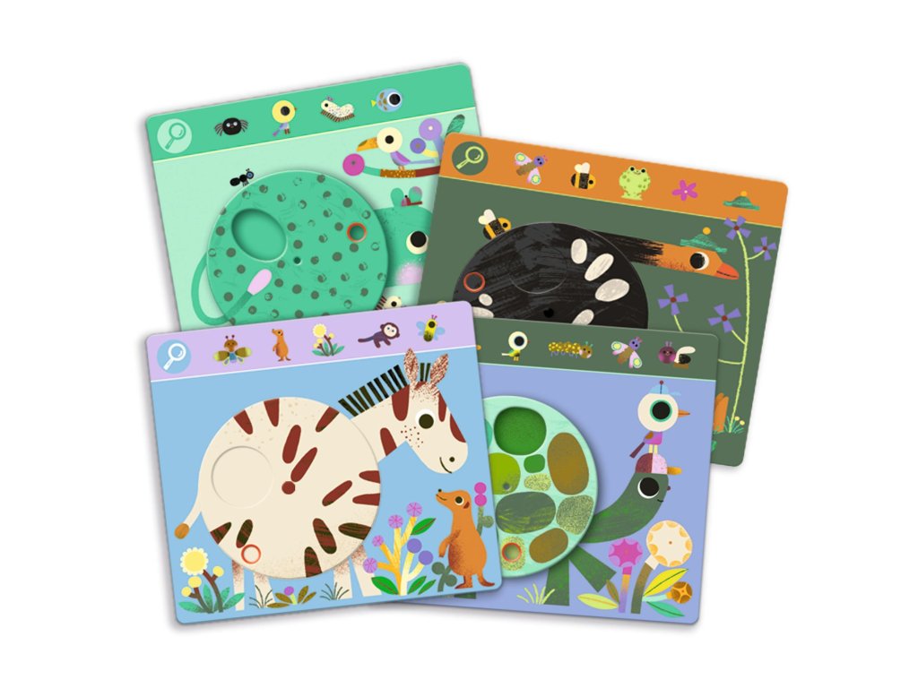V balení děti najdou 6 různých obrázků s otočným kolečkem. Na každém obrázku jsou vyobrazena zvířátka a rostliny. Dítě zatočí kolečkem a pod ním se mu objeví zvířátko či rostlina. To má za úkol najít.