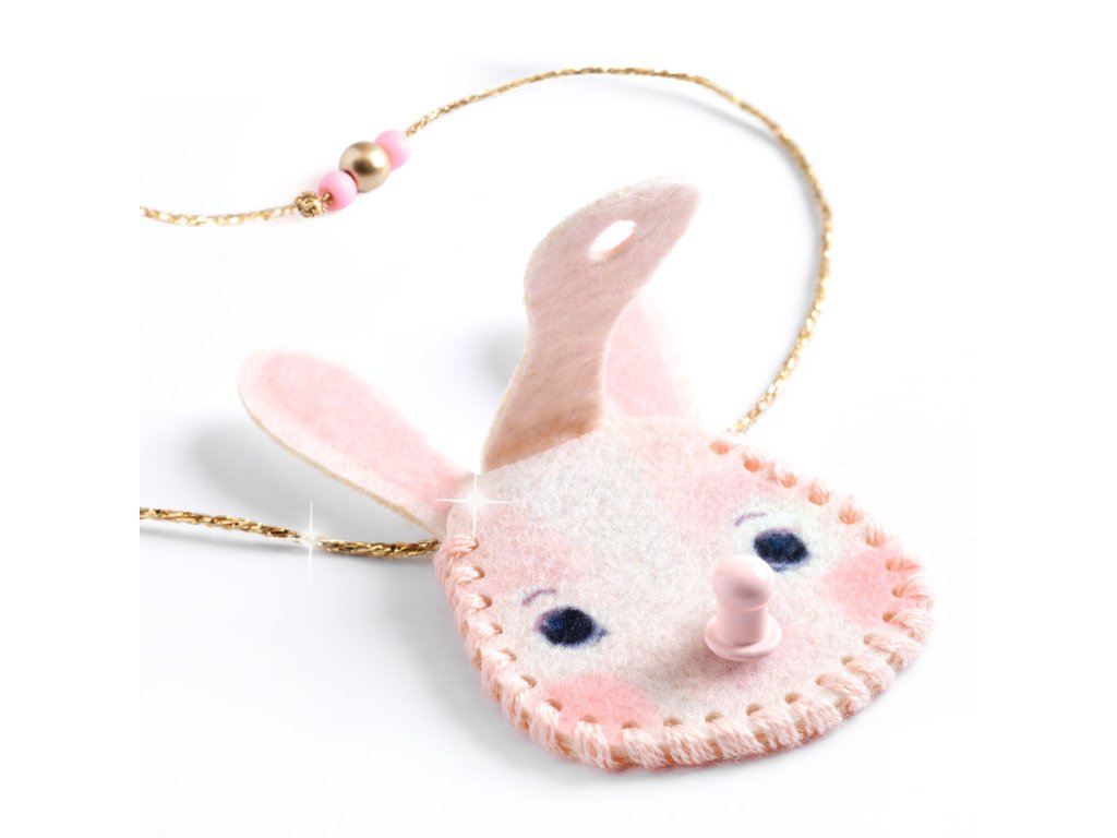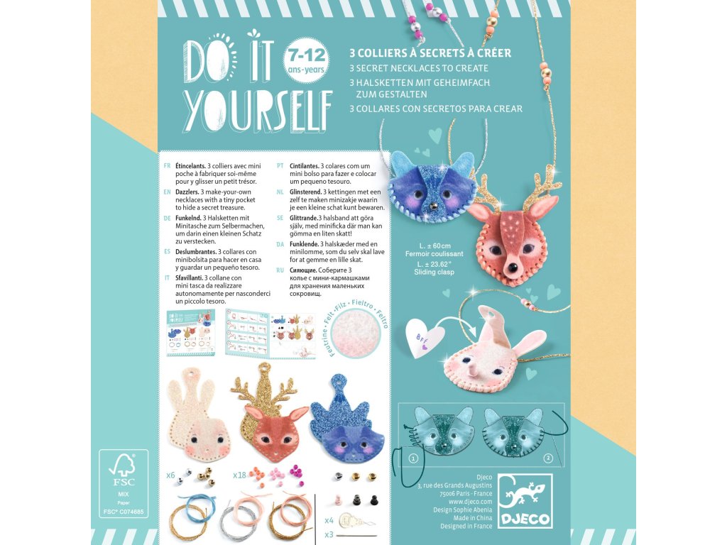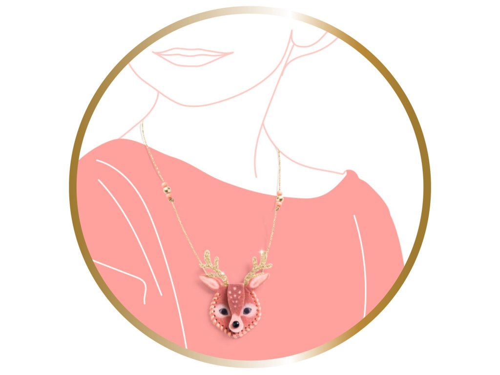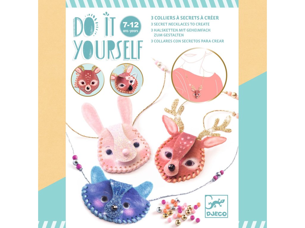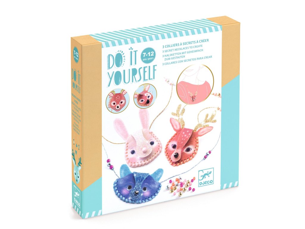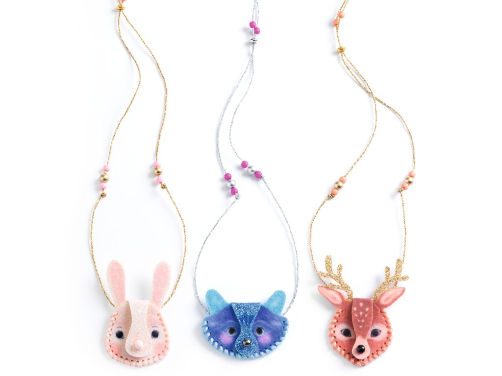 Kreativní sada Náhrdelníky od firmy Djeco z kolekce DIY je určena pro všechny tvořivé dívky a slečny. Vyrobí si tři náhrdelníky ve tvaru zvířátek. Postupně je ušijí, navlečou a dotvoří. Budou je nosit jako šperk, ale také si do nich mohou schovat svůj malý poklad nebo třeba fotografii. Sada je krásný tvořivý dárek pro holky od 7 let.