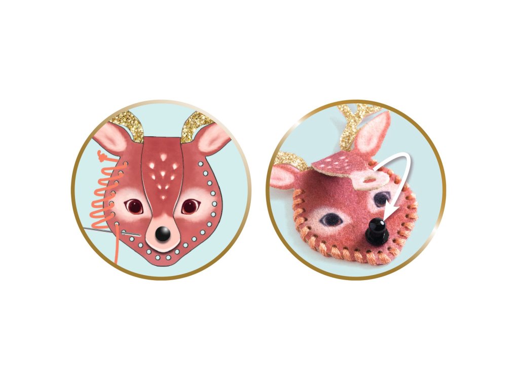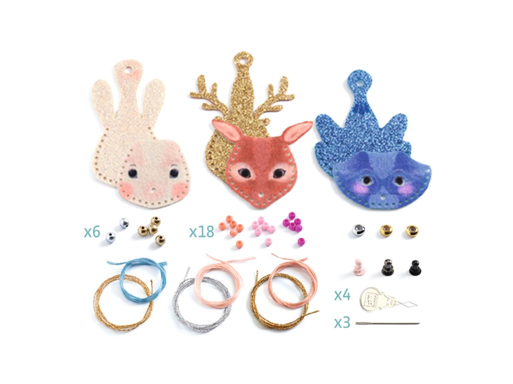 Sada obsahuje 3 perforované přívěsky z plsti ve tvaru zvířátka, 3x nit na šití, 3x nit na zavěšení, 3 jehly + navlékač jehel, 3 šroubovací knoflíky, 26 barevných korálků, 3 posuvná zapínání, návod na tvoření a 3 šablony.