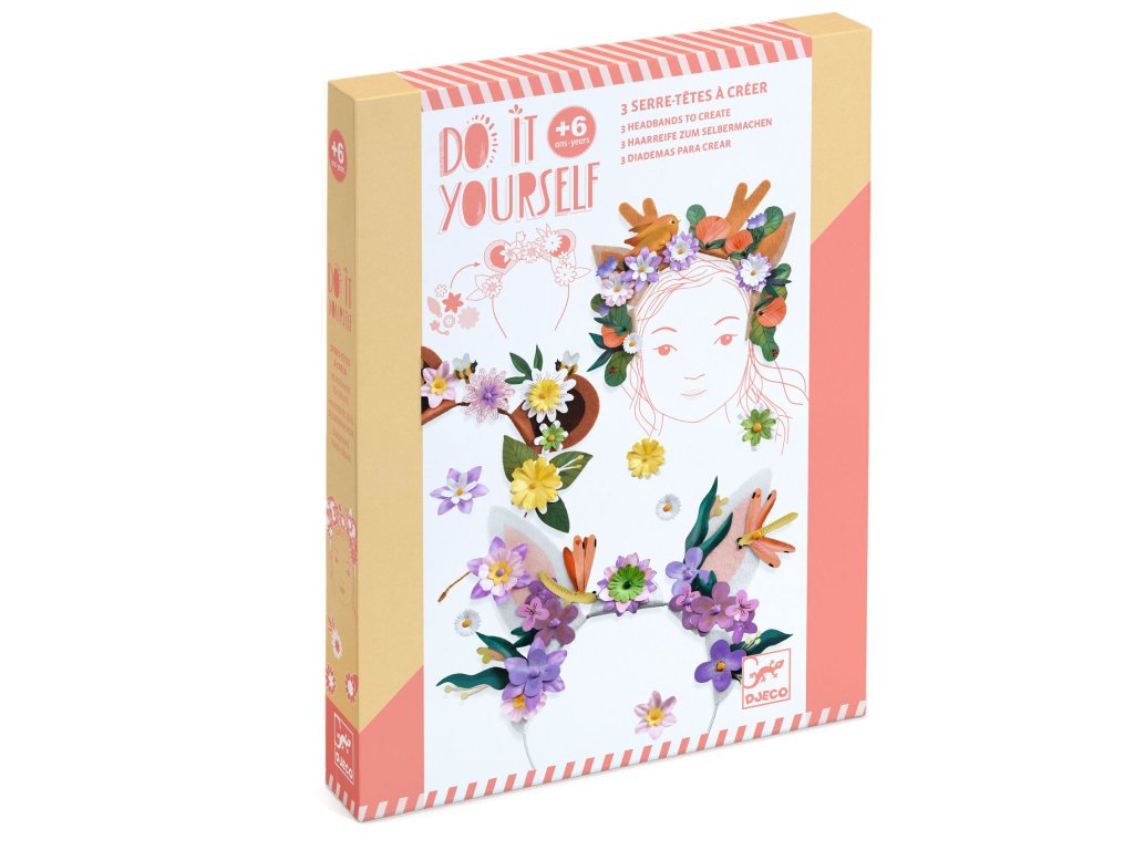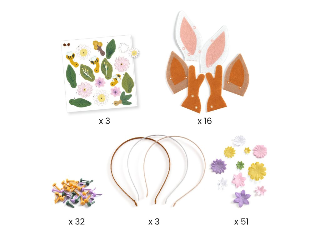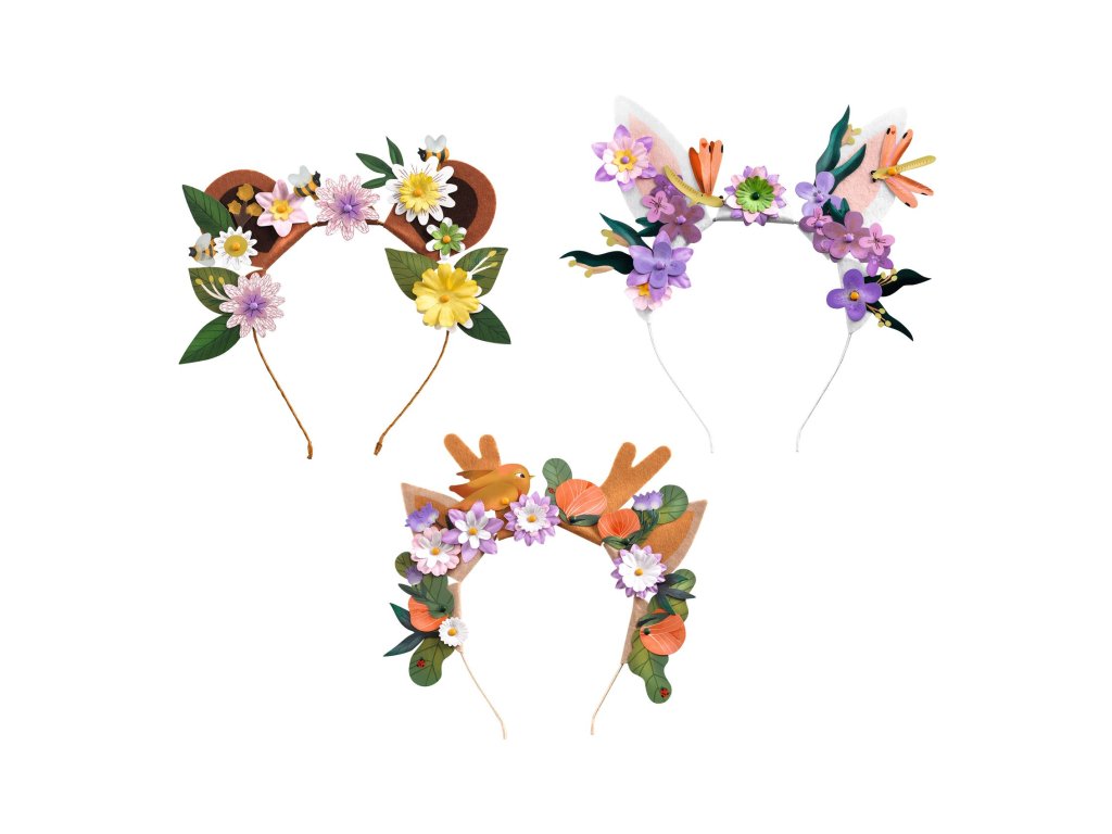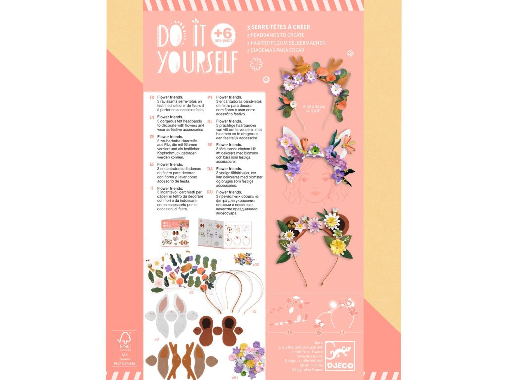 Kreativní sada Výroba čelenek Flower friends od firmy Djeco z kolekce DIY je určena pro všechny tvořivé dívky a slečny. Vyrobí si tři čelenky do vlasů pomocí zdobení květin, filcovými oušky a zvířátky. Sada je krásný dárek pro holky od 6 let.