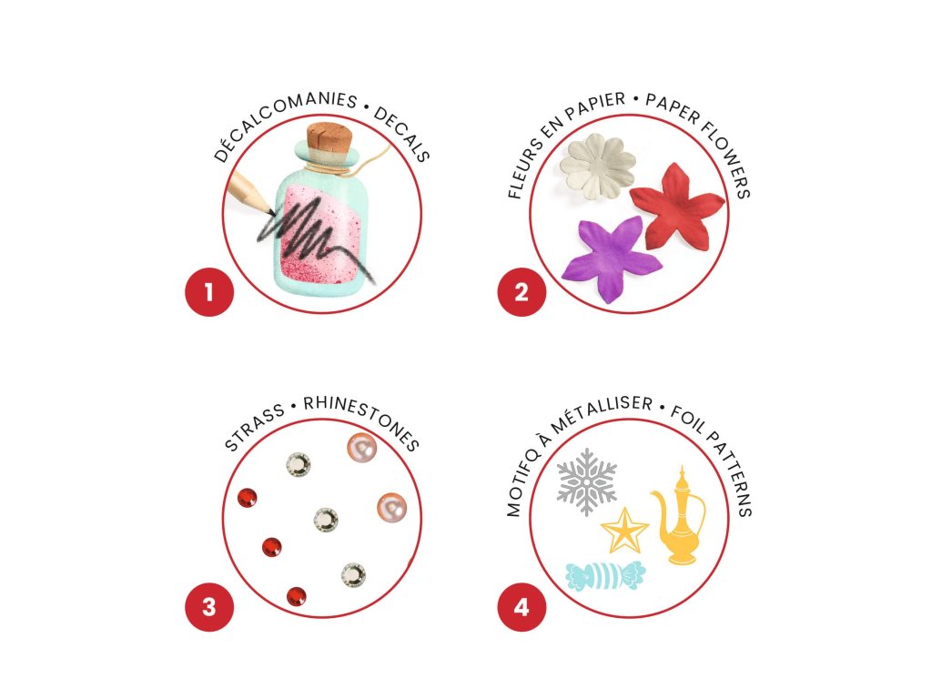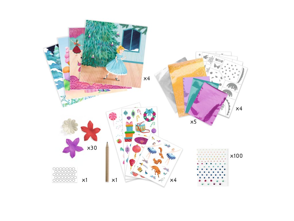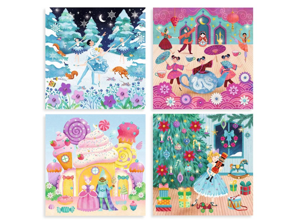 Pomocí třpytivých dílků, folií k obtisknutí, papírových květin, propisotů a pevných obrázků z kartonu děti vytvoří nádherné obrazy ze známého baletního díla Louskáček.