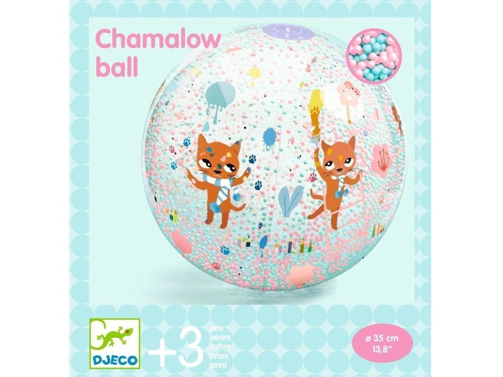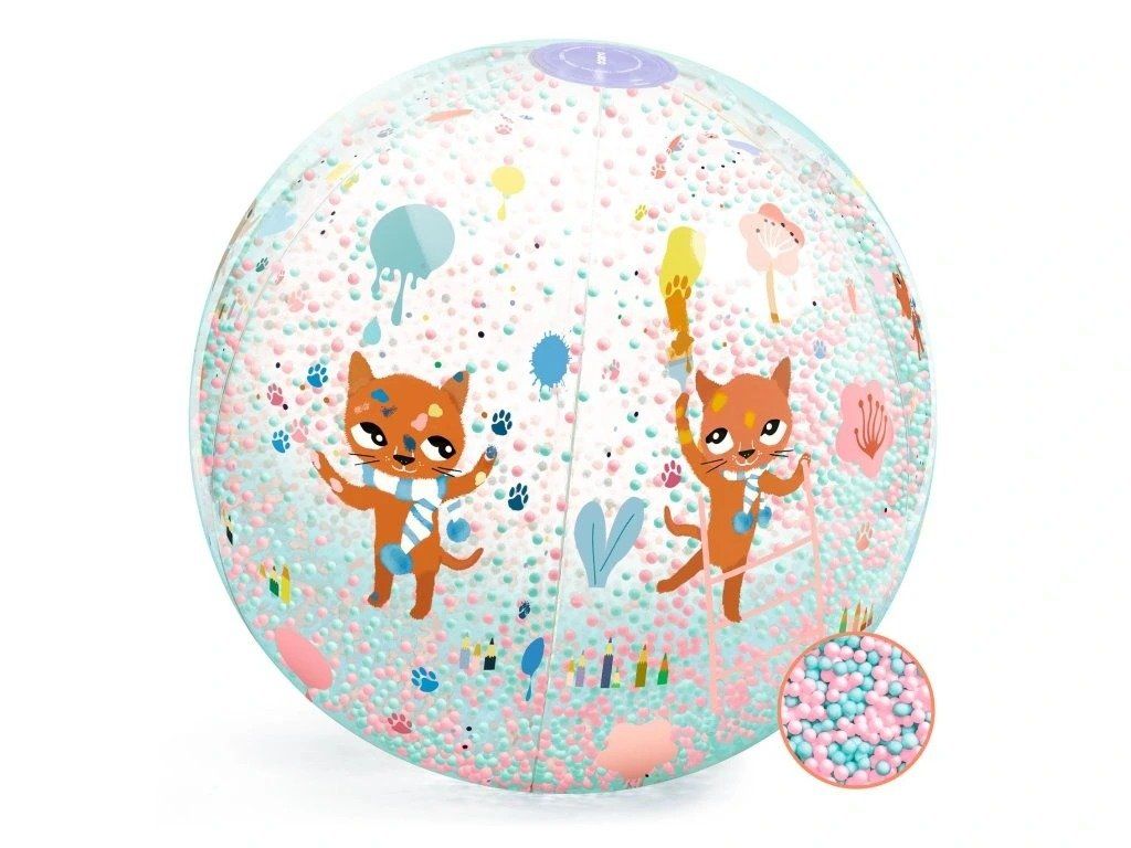 Nafukovací míč s kuličkami Kočky od firmy Djeco je lehký nafukovací míč, který zve děti k pohybu, házení i chytání. Stačí ho nafouknout a zábava může začít venku i u vody. Lehounké barevné kuličky uvnitř míče při pohybu vesele víří a vytvářejí skvělé efekty a radost dětí.