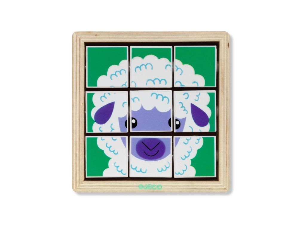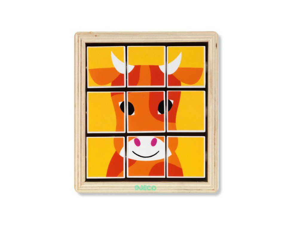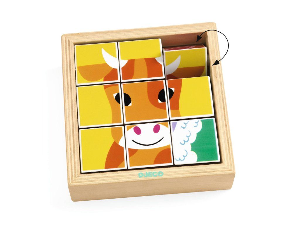 Otáčivé puzzle Farma od Djeco je motorická hračka - puzzle pro děti od 2 let v dřevěném rámu. Děti otáčejí jednotlivé díly puzzle a tím jim vznikne obrázek zvířátka. Vybrat si mohou kravičku, prasátko nebo ovečku.