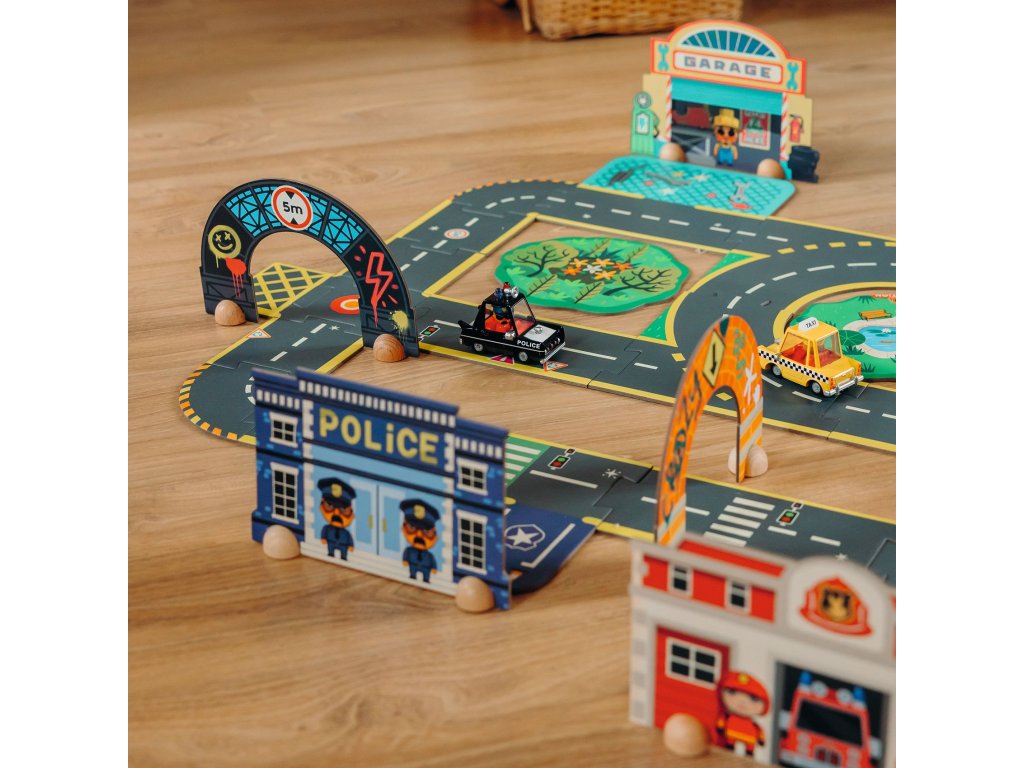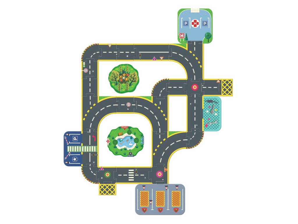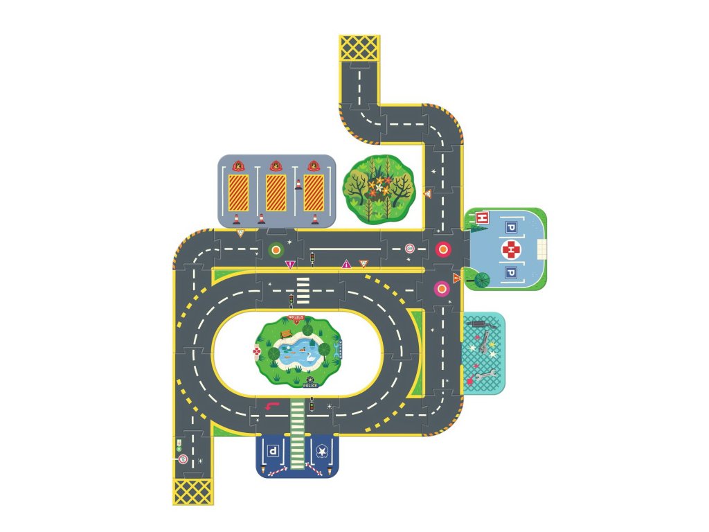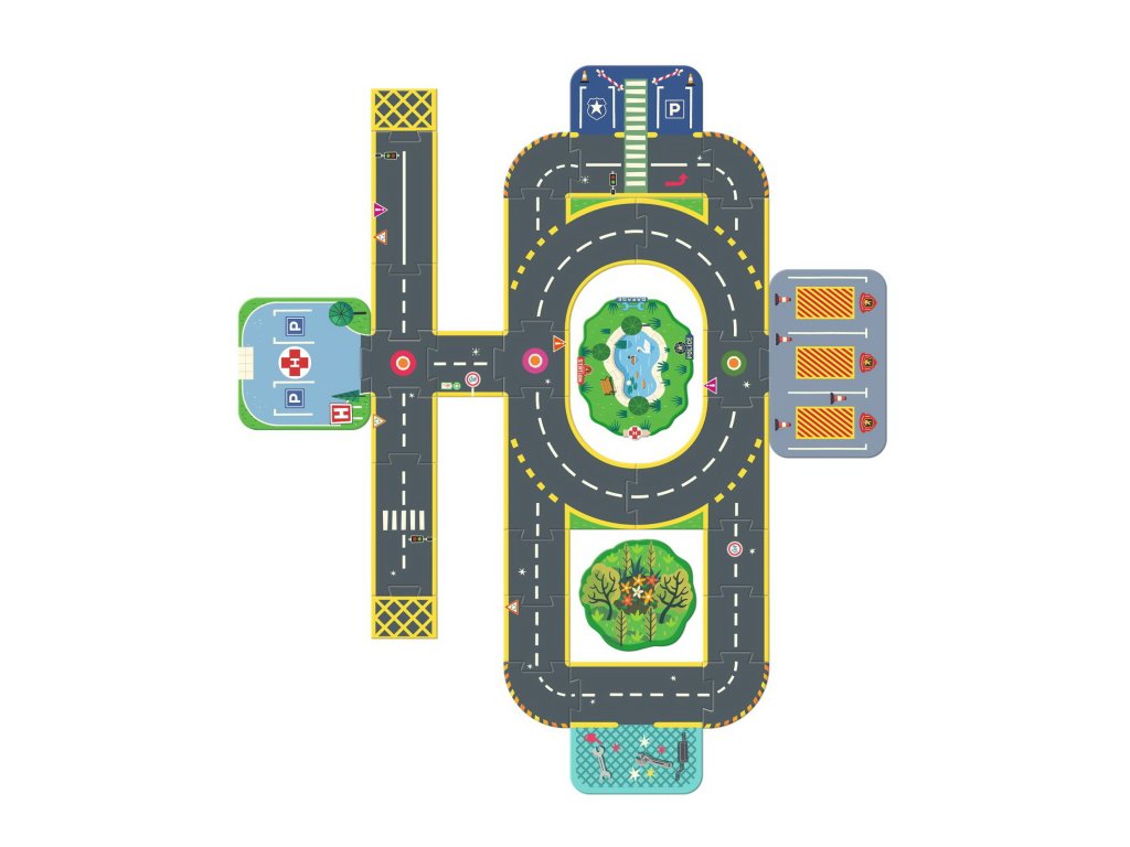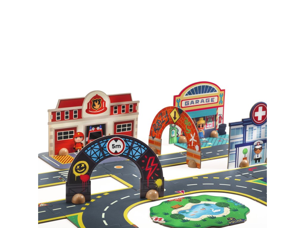 Podlahové 3D puzzle Puzzl'Up Město z kolekce Djeco Crazy Motors jsou obří podlahové puzzle pro děti od 3 let, které promění dětský pokoj v rušné město plné silnic a dobrodružství. Z velkých kartonových dílů děti postaví závodní dráhu i celé město a z 3D prvků přidají budovy i obloukové mosty. Stačí přidat autíčka z kolekce Crazy Motors a fantazie může vyrazit na plné obrátky.