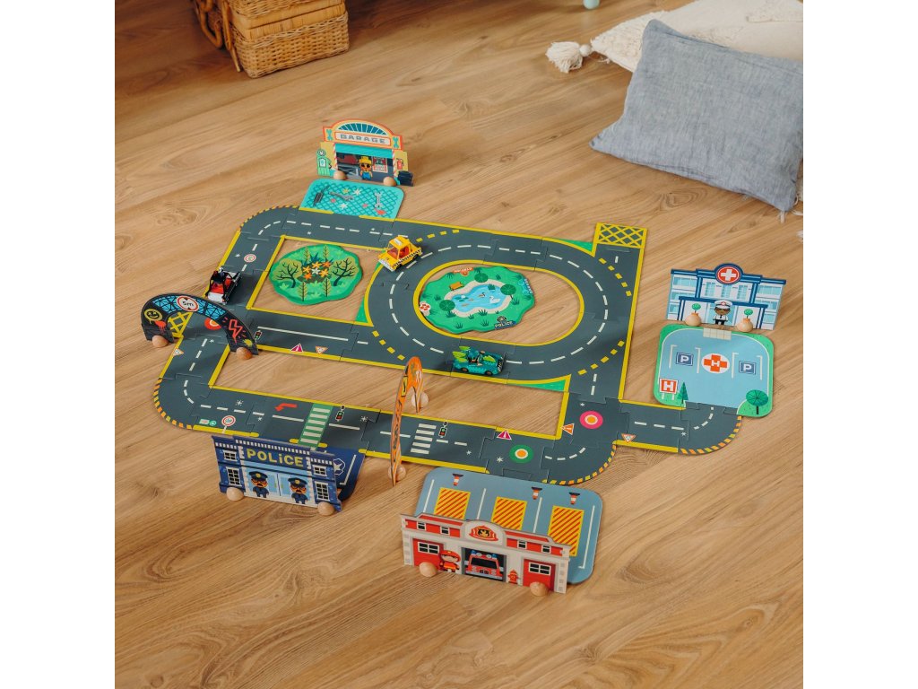 Děti mohou na puzzle silnic uspořádat závody nebo se jen tak projet třeba s autíčky. Stavby jsou umístěny na dřevěných podstavcích a pomohou vytvořit opravdový herní svět plný příběhů. Děti se vydávají na dobrodružství a hra začíná.