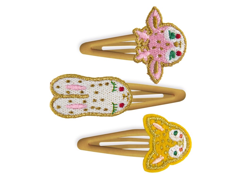 Balení obsahuje 3 zlaté sponky do vlasů (vyšívaná laň, králík a liška)