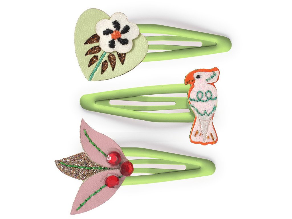 Balení obsahuje 3 kovové sponky do vlasů (srdce a list - umělá kůže, papoušek - vyšívaná látka)