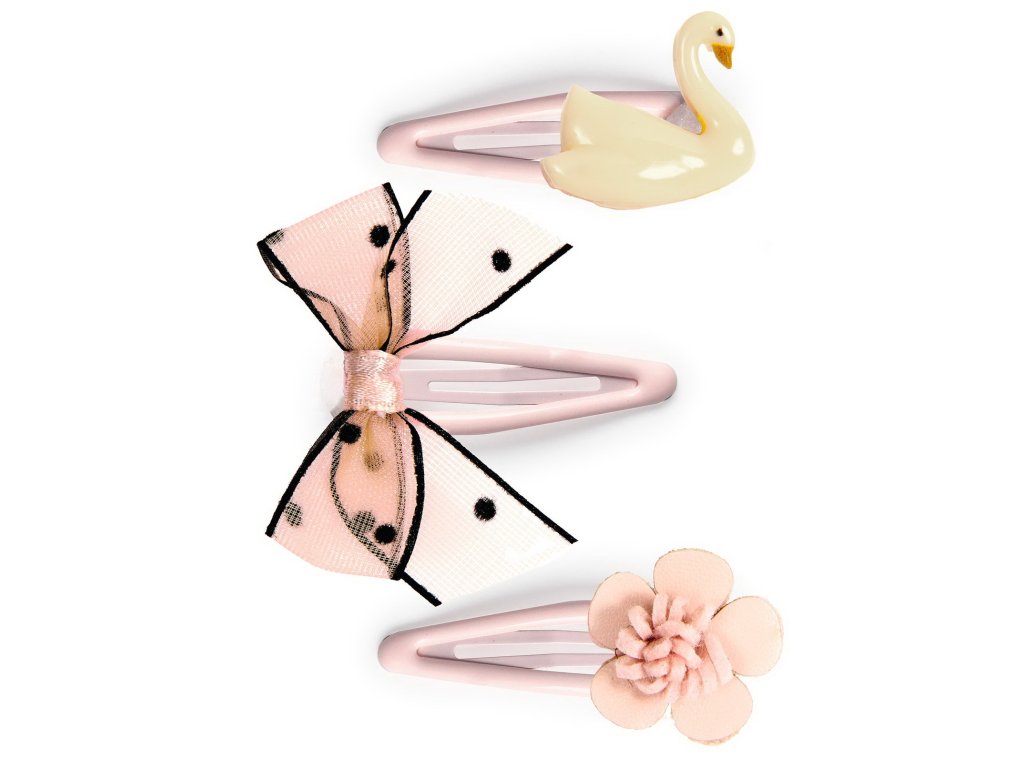 Balení obsahuje 3 kovové růžové sponky do vlasů (květina - umělá kůže, labuť - akryl, mašle - tyl)
