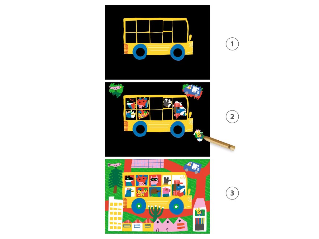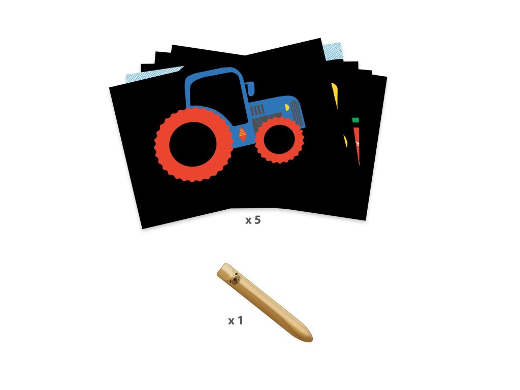 Tato výtvarná sada zabaví batolata i předškoláky. Jednoduchým způsobem pomocí škrabacího pera, které je dostatečně velké na úchop pro malé děti, seškrábou plochy a objeví se obrázek. Děti bude bavit proces objevování se obrázku a zlepší si také jemnou motoriku. Starší děti mají možnost se při vyškrabávání věnovat také detailům.