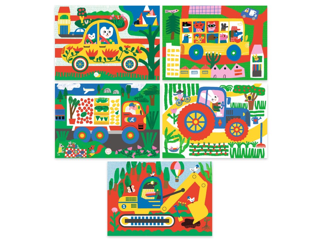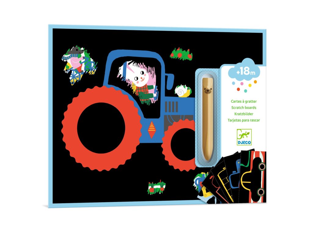 Vyškrabání pro nejmenší Auta od firmy Djeco je kreativní sada, která obsahuje vyškrabávací obrázky s motivy dopravních prostředků, bagrů a traktoru pro děti od 18 měsíců. Ať seškrábou celou plochu nebo jen detaily, vždy bude výsledný obrázek krásný.