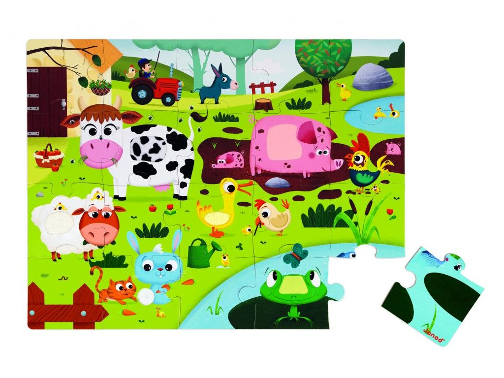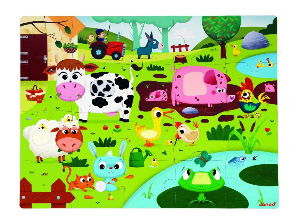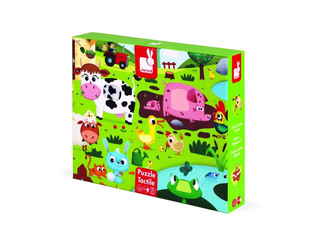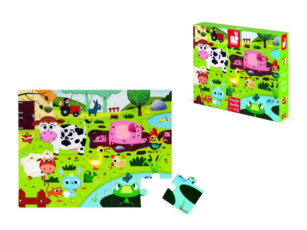 Hmatové puzzle Zvířátka na farmě Janod se bude líbit všem malým dětem.Je kravička hebká?A co žabka?Děti poskládají krásný obrázek plný zvířátek a jejich zvířecích kožíšků. Mohou si osahat, jaký kožíšek je nejvíc hebký.