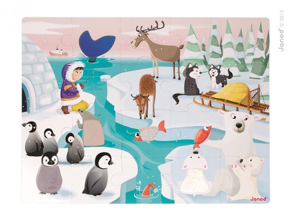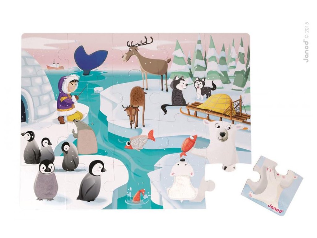 Hmatové puzzle Život na ledě Janod se bude líbit všem malým dětem. Jaké bříško má tučňák? A co velryba? Děti poskládají krásný obrázek plný zvířátek a ledu. Mohou si osahat, jaký kožíšek je nejvíc hebký.