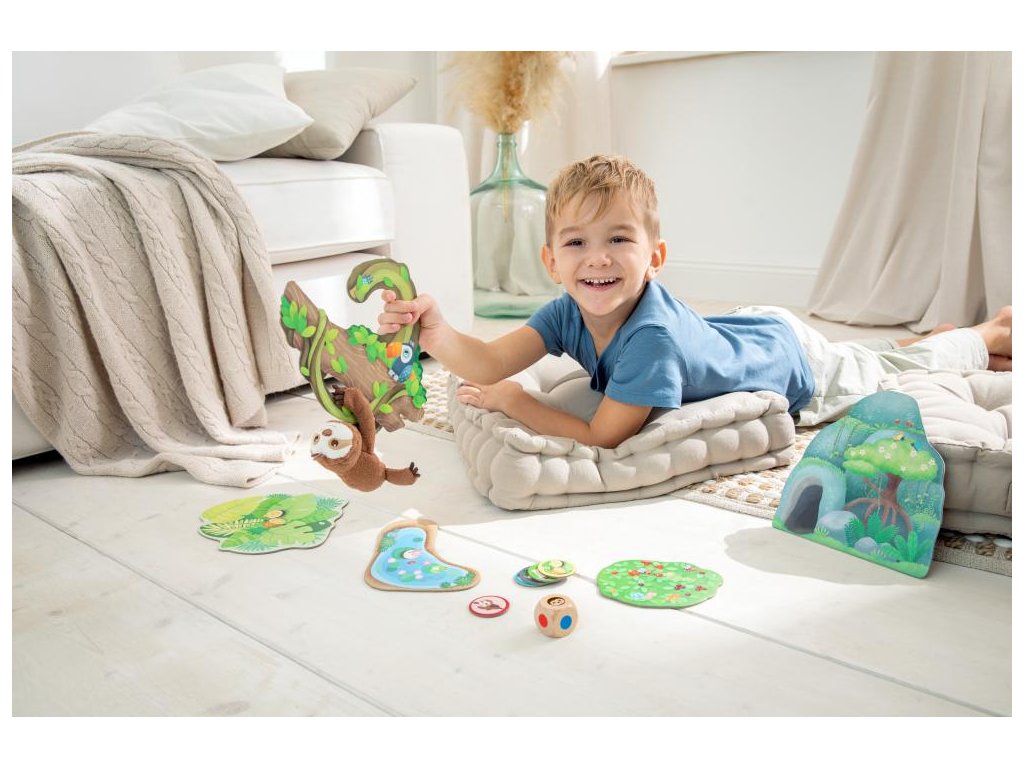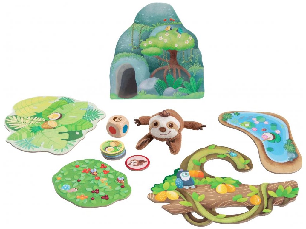 Zvědavý malý lenochod, obklopený svěže zelenými rostlinami a lahodným ovocem, chce prozkoumat džungli. Obvykle se pohybuje docela pomalu, ale pak umí velmi rychle zmizet. Dvě pohybové hry umožňují dětem sledovat stezku za roztomilým malým lenochodem. Společnou hrou stimulujte jemnou i hrubou motoriku, asociační schopnosti a představivost. Kdo nejrychleji najde malého lenochoda na jednom ze svých oblíbených míst?