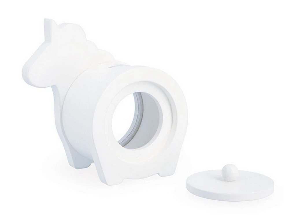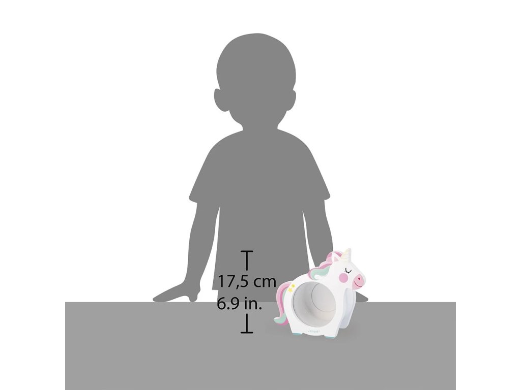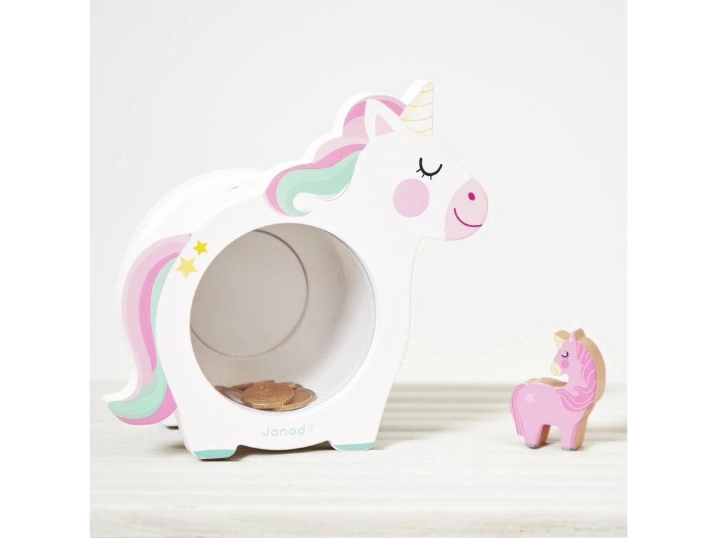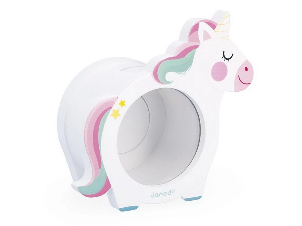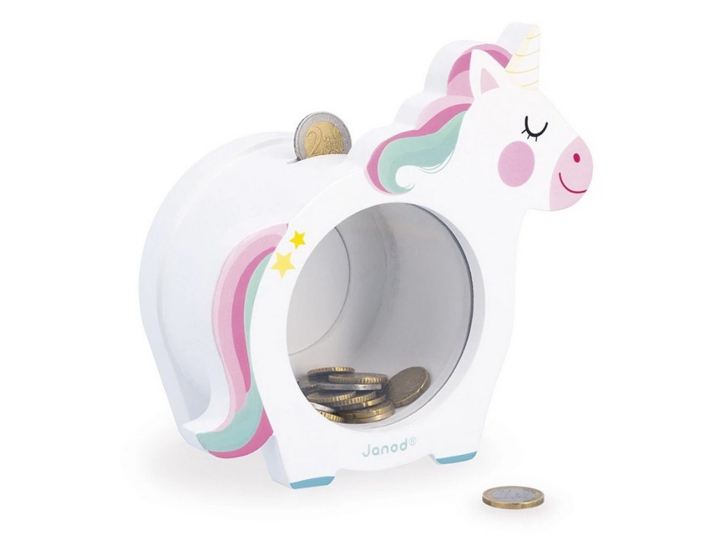 Dřevěná pokladnička Jednorožec od firmy Janod schová všechny dětské úspory a první peníze. Díky průhlednému bříšku jednorožce děti uvidí, jak jim přibývají mince i bankovky.