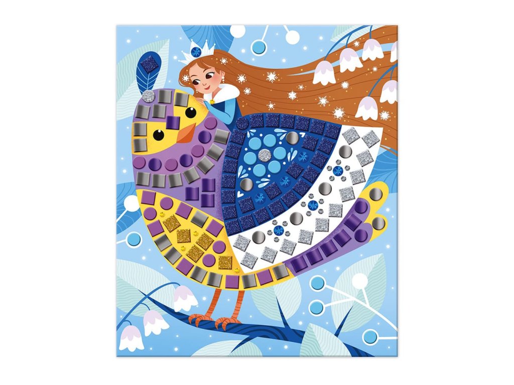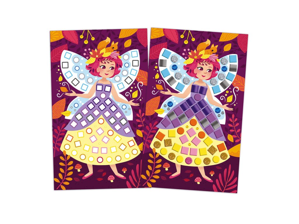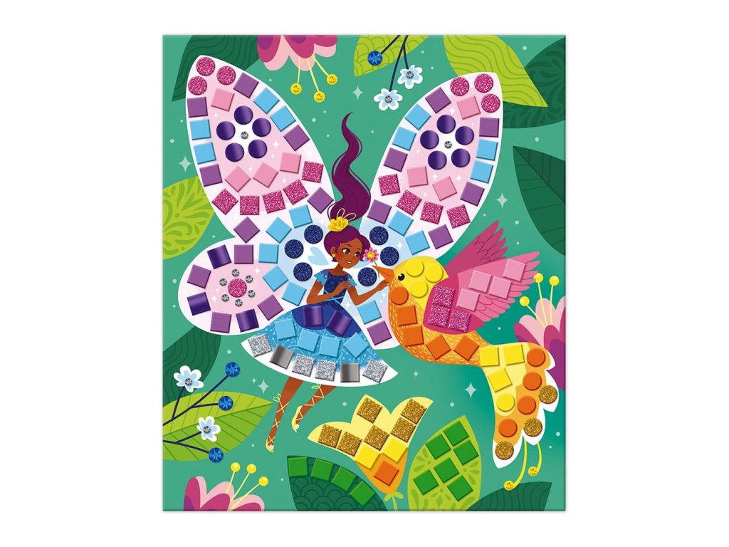 Kreativní sada obsahuje 8 pevných obrázků, na které děti lepí barevné čtverečky mozaiky, lesklé kamínky a třpytky.