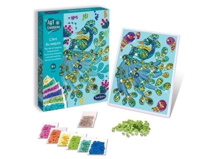 Zábava bez obrazovek. To je keativní sada Barevné flitry Páv od Sentosphere, která vám umožní vytvořit si kouzelný třpytivý obrázek pomocí zapichování drobných dílků mozaiky.