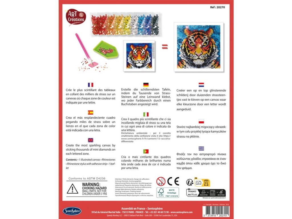 Balení obsahuje: malované samolepící plátno s motivem tygra, mini barevné diamanty v několika různých barvách, plastová miska na nabírání diamantů, speciální pero na nabírání diamantů, vosková hmota pro vytvoření lepící špičky pro nabírání diamantů a návod k použití