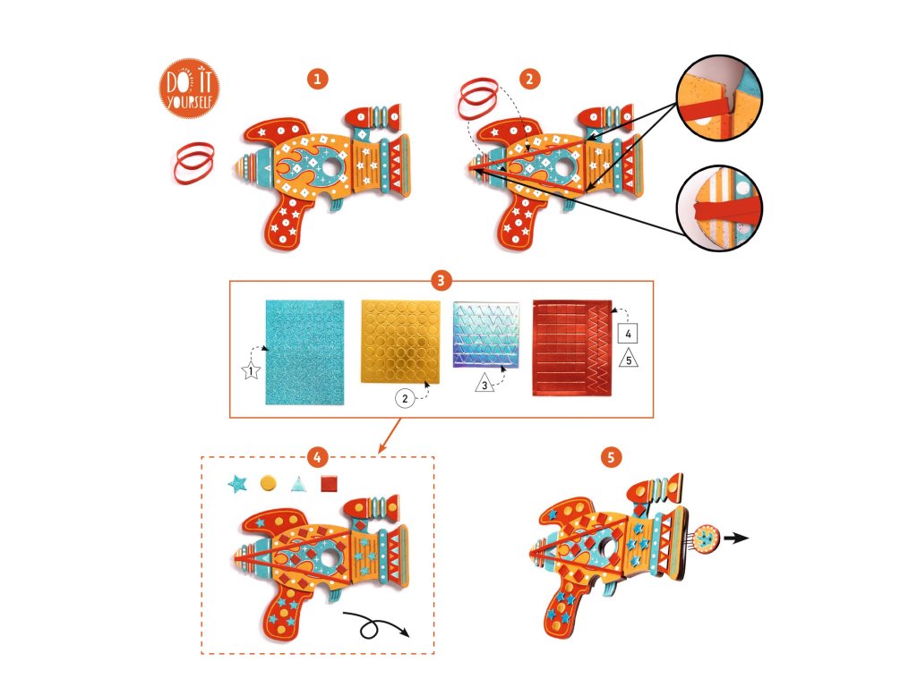 Kreativní sada Vesmírné pistolky z kolekce DIY Djeco je určena pro všechny tvořivé děti. Pomocí této sady si děti vytvoří parádní pistolky na hraní.