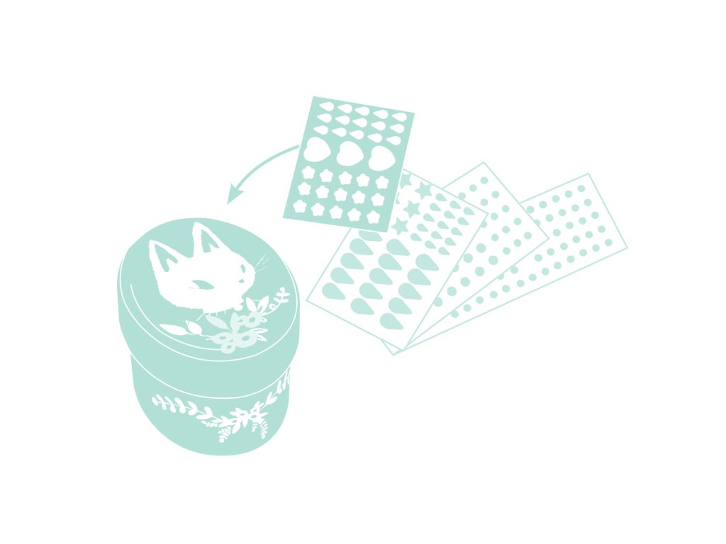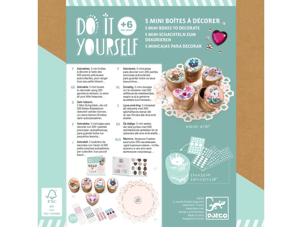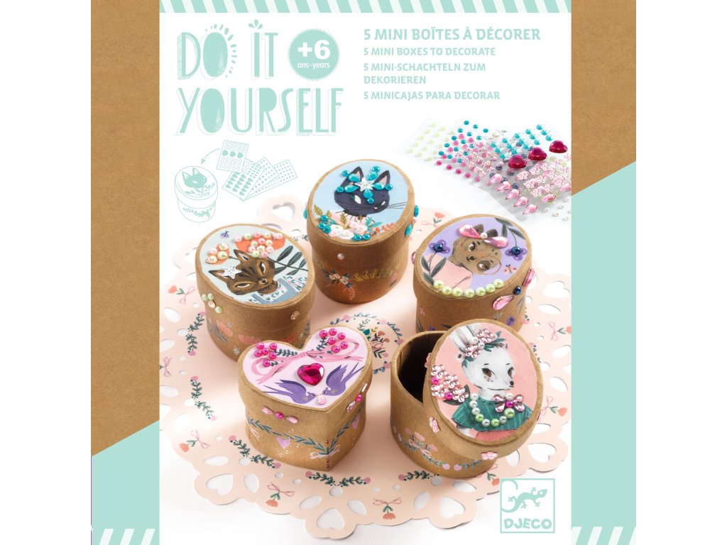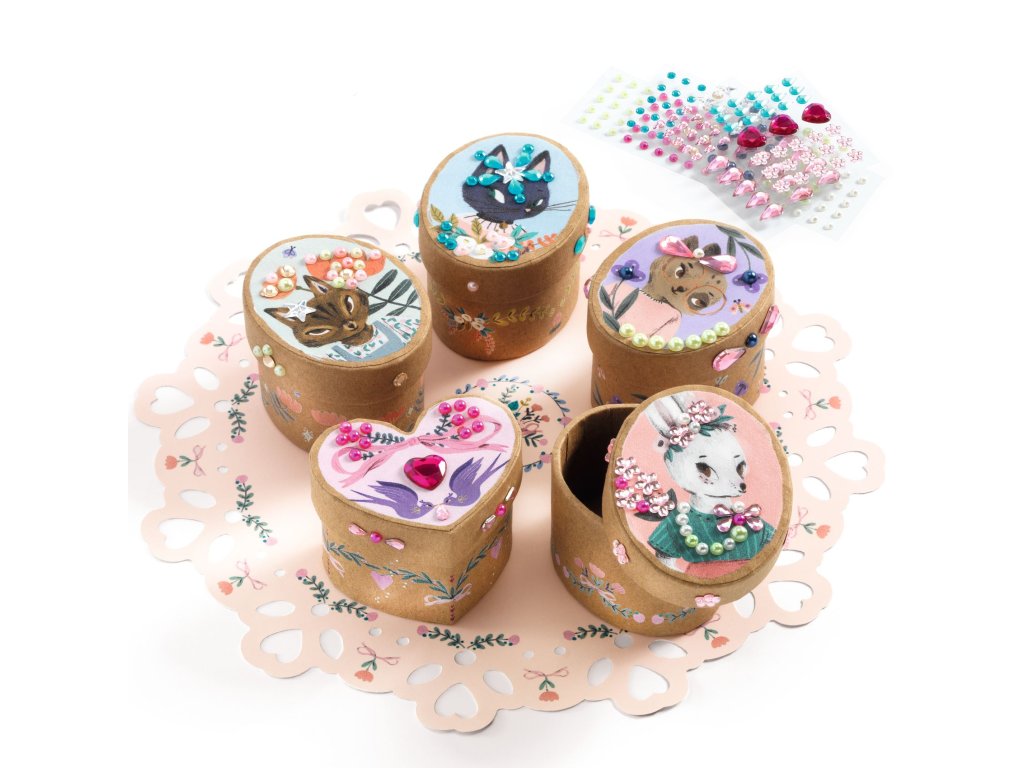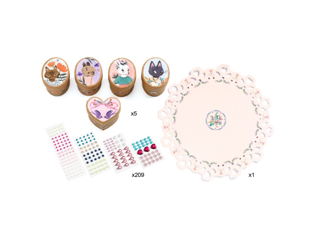 V balení děti najdou 5 mini krabiček na drobné poklady. Zdobí je malovaná zvířátka, která jsou něžná a roztomilá. Aby byly krabičky dokonalé, děti je polepí postupně podle návodu malými kamínky a třpytkami. V balení jich je více než 209 kousků a jsou samolepící. Po dokončení krabiček je mohou umístit na něžné prostírání, které doladí celé dílo k dokonalosti.