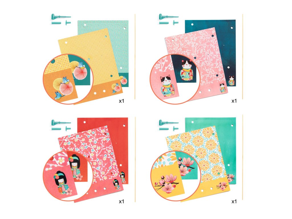 Sada obsahuje 4 pestrobarevné listy papíru o velikost 23x29 cm, 4 dřevné tyčky a 4 spojovací šroubky a návod ke tvoření.