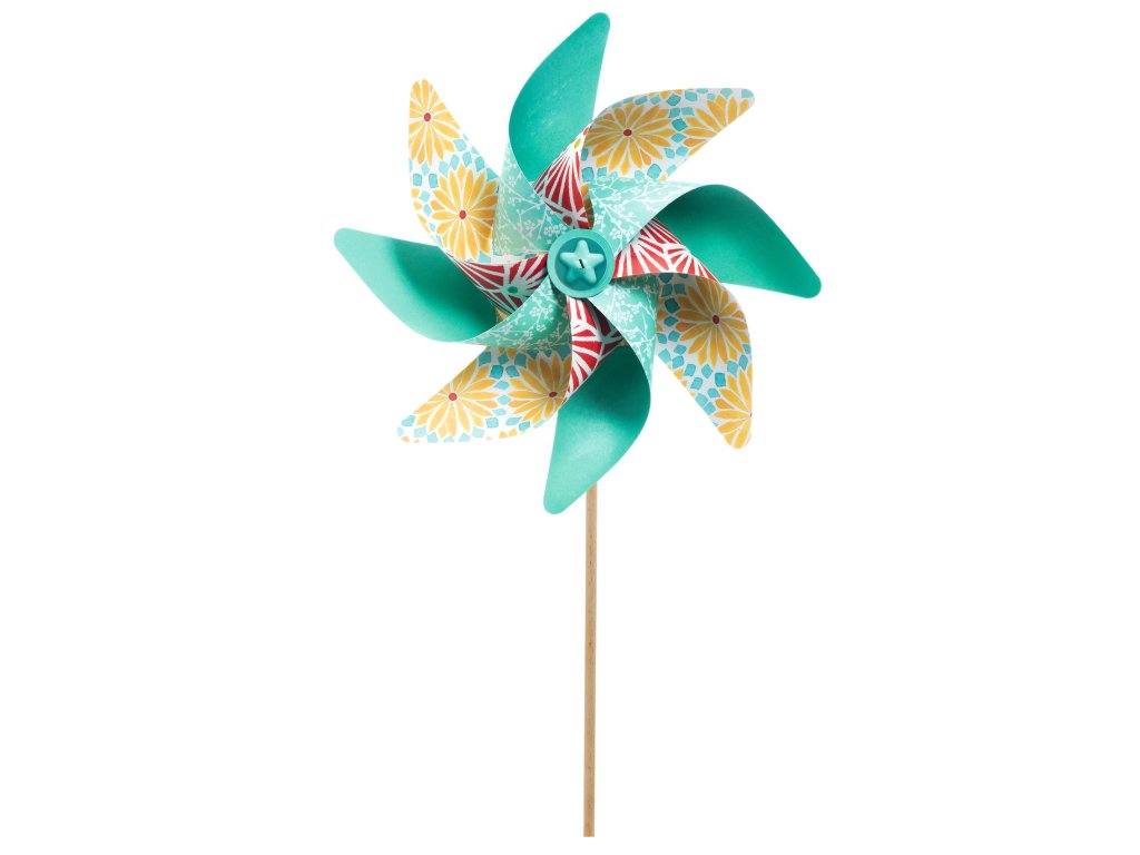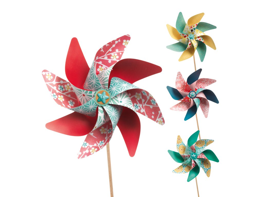 V balení najdou vše, co je potřeba pro výrobu papírových větrníků. Poskládají je podle návodu a barevné větrníky uvedou do pohybu.
