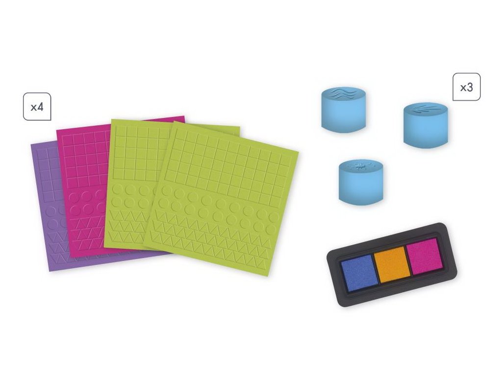 Sada obsahuje 4 pevné obrázky se 4 archy mozaikových dílků k dotvoření, 5 pevných obrázků k dorazítkování, 3 razítka a trojitou barevnou razítkovací podušku a návod k použití