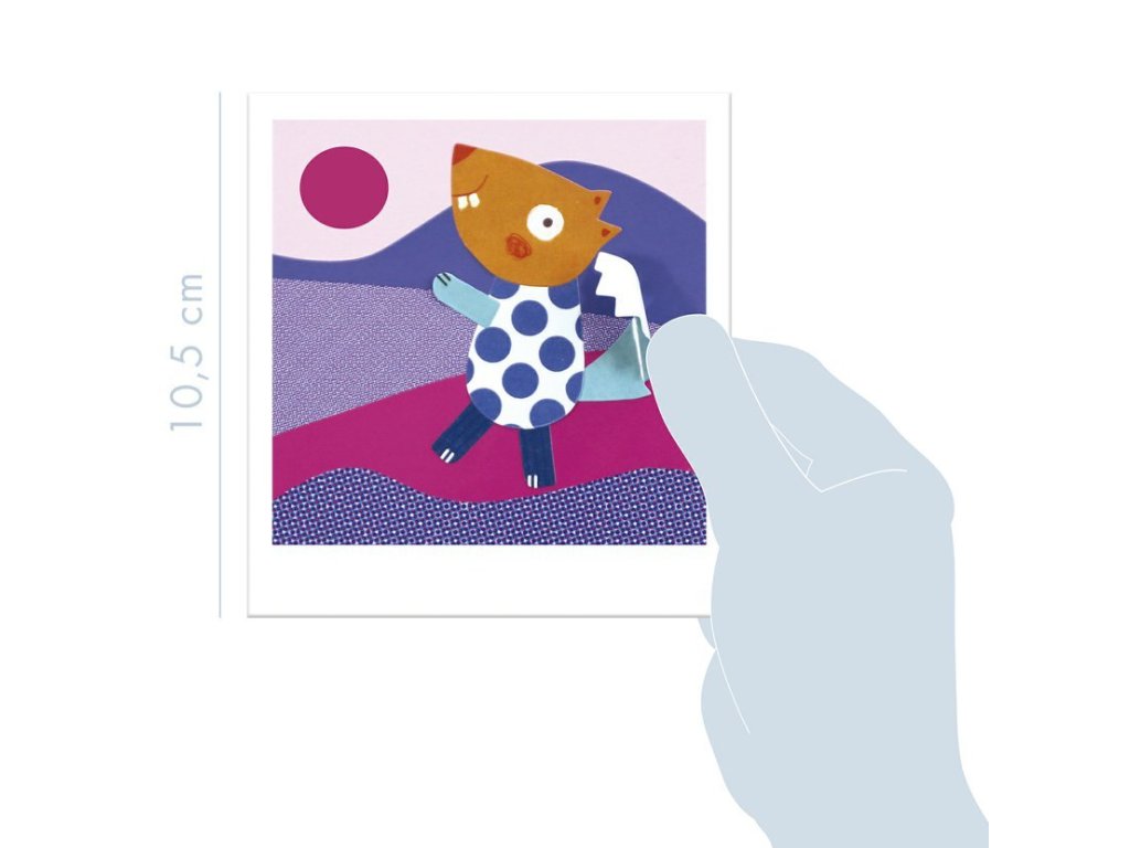 V balení děti najdou 10 kartonových obrázků, na kterých jsou vyobrazeny různá pozadí - krajiny a 8 archů samolepek se zvířátky.