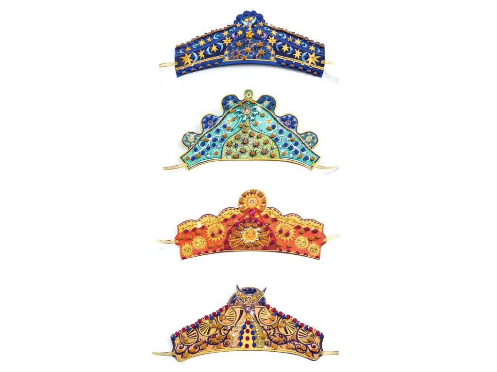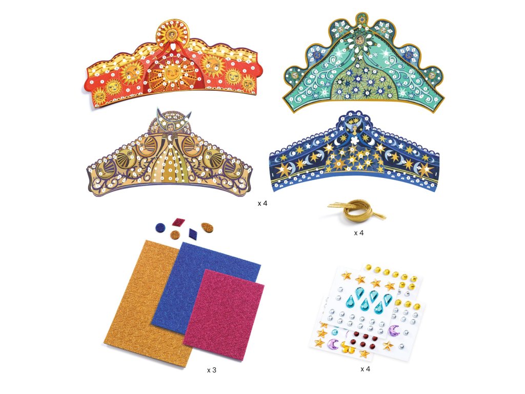 Sada obsahuje 4 barevné korunky, 3 listy pěnových třpytivých mozaiek, 4 listy třpytivých drahokamů a 4 zlaté stužky a návod k dotvoření