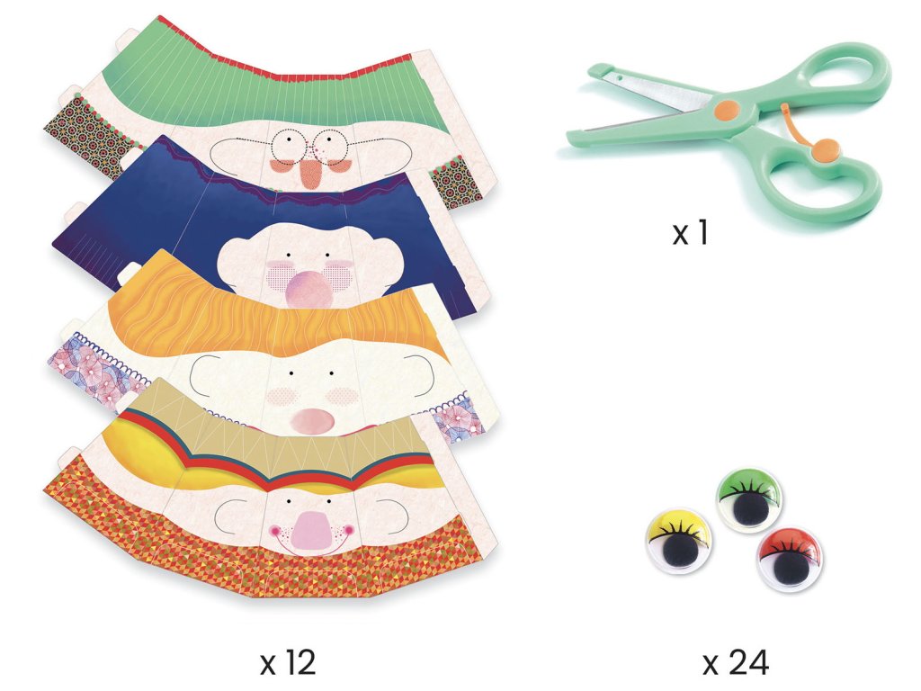 Jak postupovat? Vyberte si první postavičku. Tu která s vám nejvíc líbí. Složte ji a upevněte. Následně vymyslete (nebo se inspirujte návodem), jaký účes by jí slušel a vytvořte ho pomocí nůžek. Nůžky, které jsou součástí balení jsou opravdové nůžky, pro děti však dostatečně bezpečné (bez ostré špičky). Jste spokojeni s vlasy? Vyberte postavičce oči. A nalepte je. Tak! Je postava dokonalá? Pokud ano, máte zde nového kamaráda. A aby mu nebylo smutno, vytvořte mu ještě další přátele.