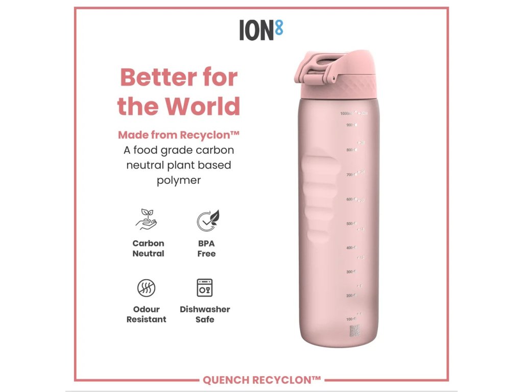 Ekologická láhev Ion8 je vyrobena ze zdravotně nezávadného materiálu recyclon - transparentně uhlíkového neutrálního plastu bez BPA. Materiál je lehký, snadno omyvatelný a odolný vůči zápachu. Chuť nápoje zůstává čerstvá a plná chuti.