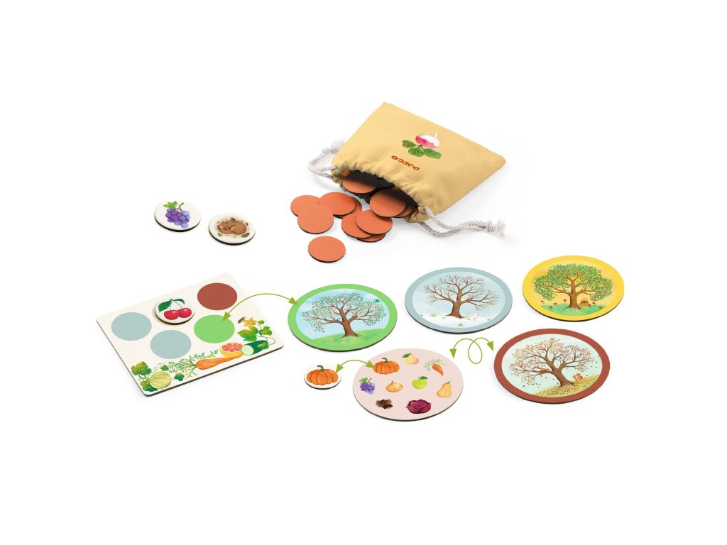 Naučte se nejdříve, které jídlo - ovoce či zelenina, zvířátka a další věci charakterizují každé roční období. Tyto obrázky jsou vyobrazeny na zadní straně velkých kulatých dílků ročních období. Následně tahejte z pytlíku žetony s obrázky a snažte se je umístit na svoji hrací desku. Nejprve však musíte správně říct, zda patří k jaru, léto, podzimu či zimě. Pokud jste odpověděli správně, můžete žeton umístit. Odpověděli jste špatně? Smůla, vraťte žeton do sáčku. Správná odpověď, ale tento žeton na vaši hrací desku nepatří? Bohužel. Vraťte ho zpět do pytlíku a pokračuje další hráč. Kdo jako první zaplní hrací desku, vyhrává.