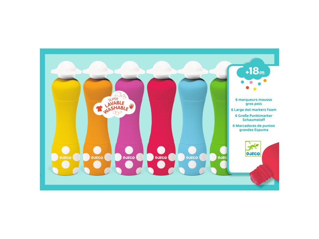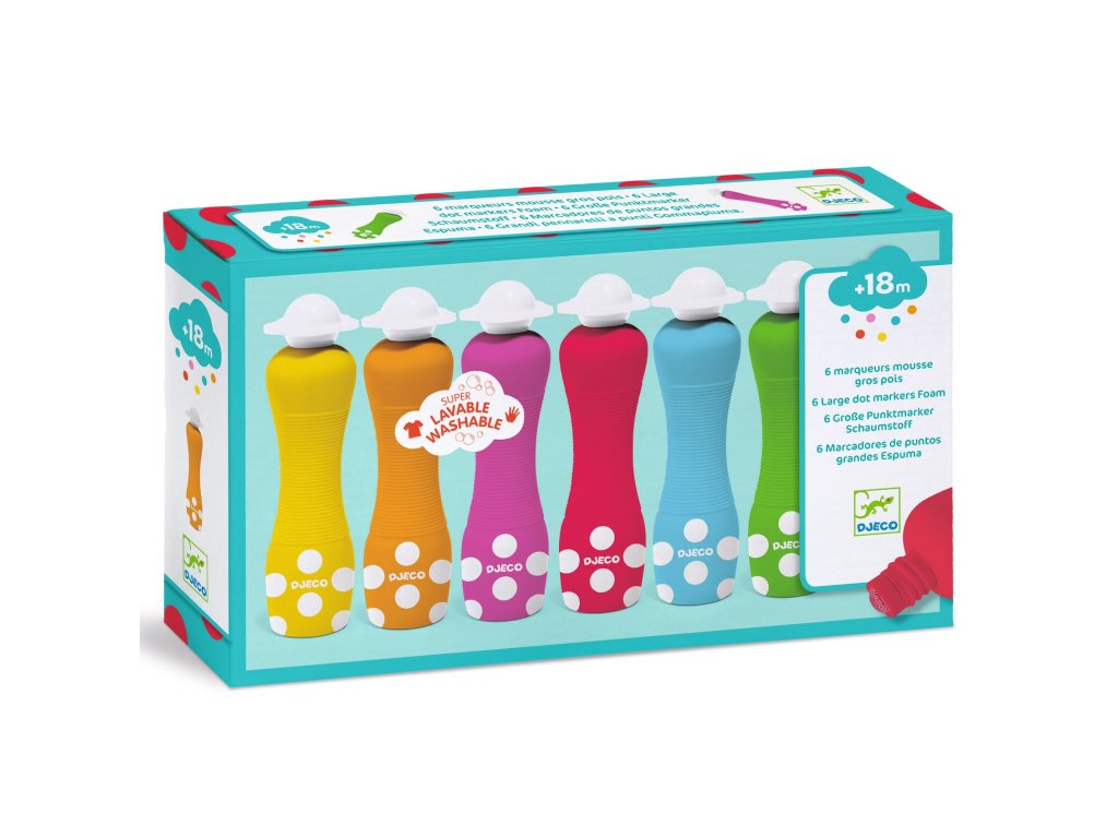 Sada malovátek Djeco je 6 kusů ergonomicky upravených malovacích lahviček s houbičkou - aplikátorem, pomocí kterých mohou malovat i nejmenší děti.