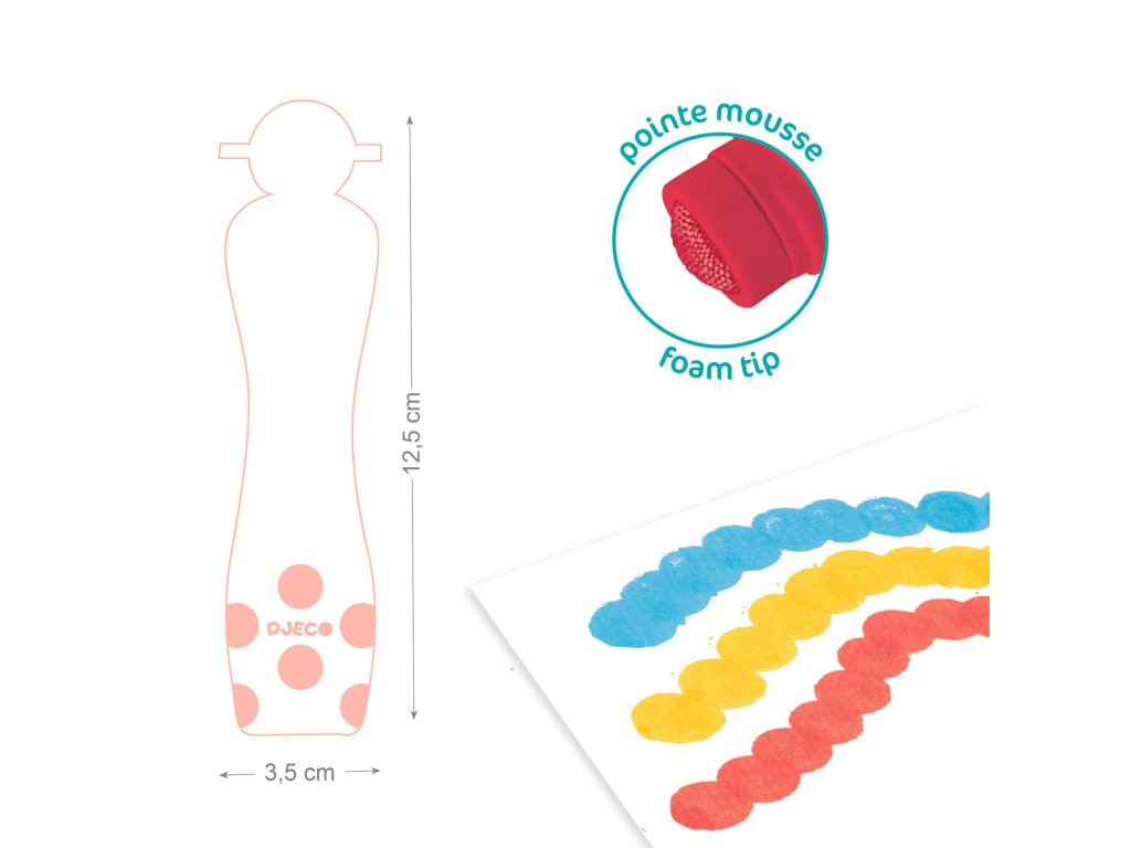 Lahvičky jsou opatřeny malou houbičkou, díky které děti mohou pohodlně a snadno barvy nanášet na papír, malovat silné čáry, ťupkovat obrázky a vybarvovat větší plochy.