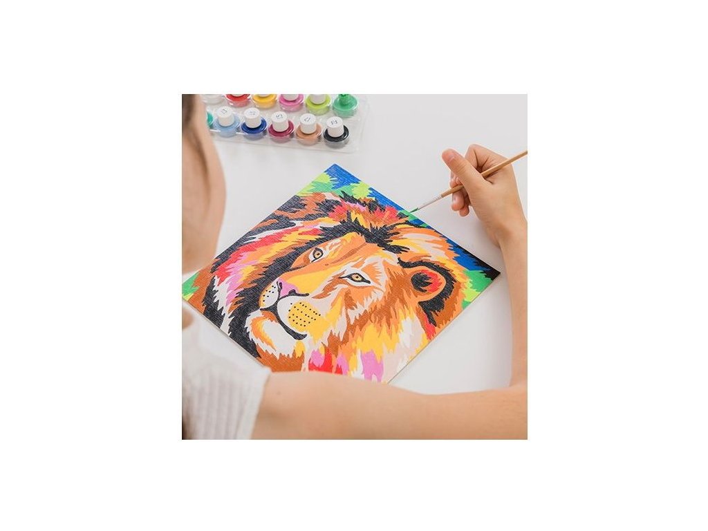 Balení obsahuje: 2 pevné obrazy (22x22 cm), 12 akrylových barev, 1 štětec, 1 paleta a návod k použití.