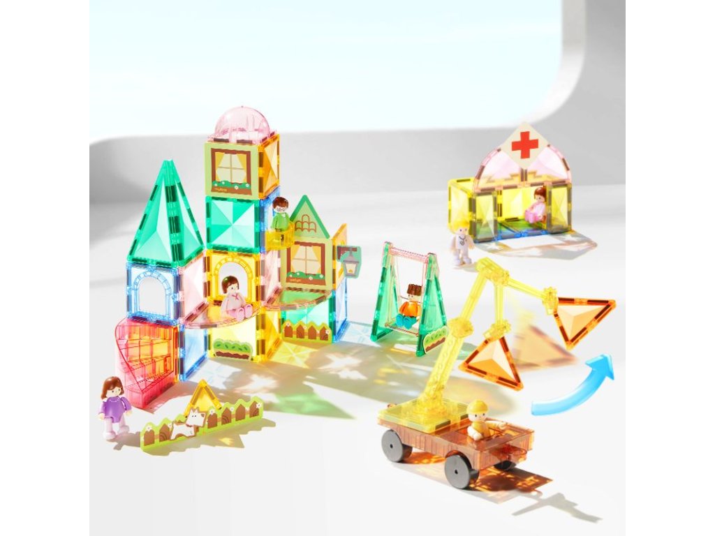 Dílky stavebnice jsou vyrobeny v různých barvách průhledného a potištěného bezpečného plastu, který se bude fantasticky vyjímat na světle. Každý díl obsahuje 6-8 magnetů.