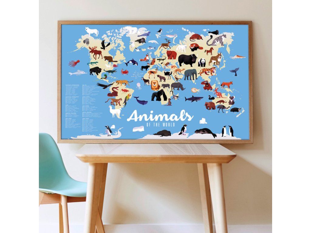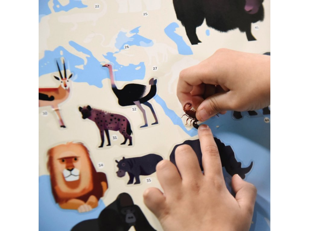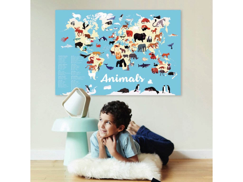 S tímto velkým plakátem děti objeví více než 70 nejvýznamnějších zvířat světa: klokana, tygra, orangutana, koalu, medvěda hnědého, maki cattu… Děti se je naučí lokalizovat na mapě světa v jejich přirozeném prostředí - na všech kontinentech. Je to skvělým způsob, jak si zapamatovat názvy zvířat a zjistit, kde na Zemi žijí.