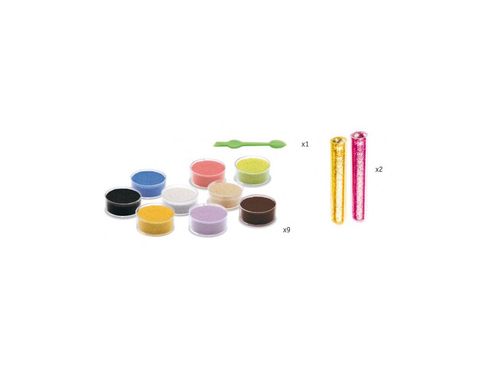 Sada obsahuje 4 předlohy, 9 krabiček s barevným pískem, 2 tuby se třpytkami, špachtličku na odstraňování folie a podrobný ilustrovaný návod.