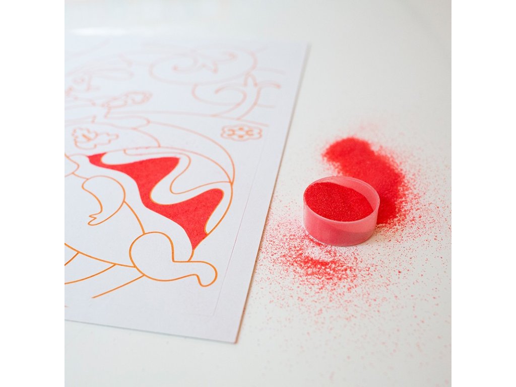 Děti podle návodu odstraní vyznačené plochy, které jsou samolepicí. Na tyto plochy poté nasypou barevný písek podle obrázku či fantazie. Přebytečný písek nasypou zpět do příslušného kelímku. Děti tak vytvoří krásné obrázky, kterými si budou moci vyzdobit pokojíček, nebo si je nechat zarámovat.